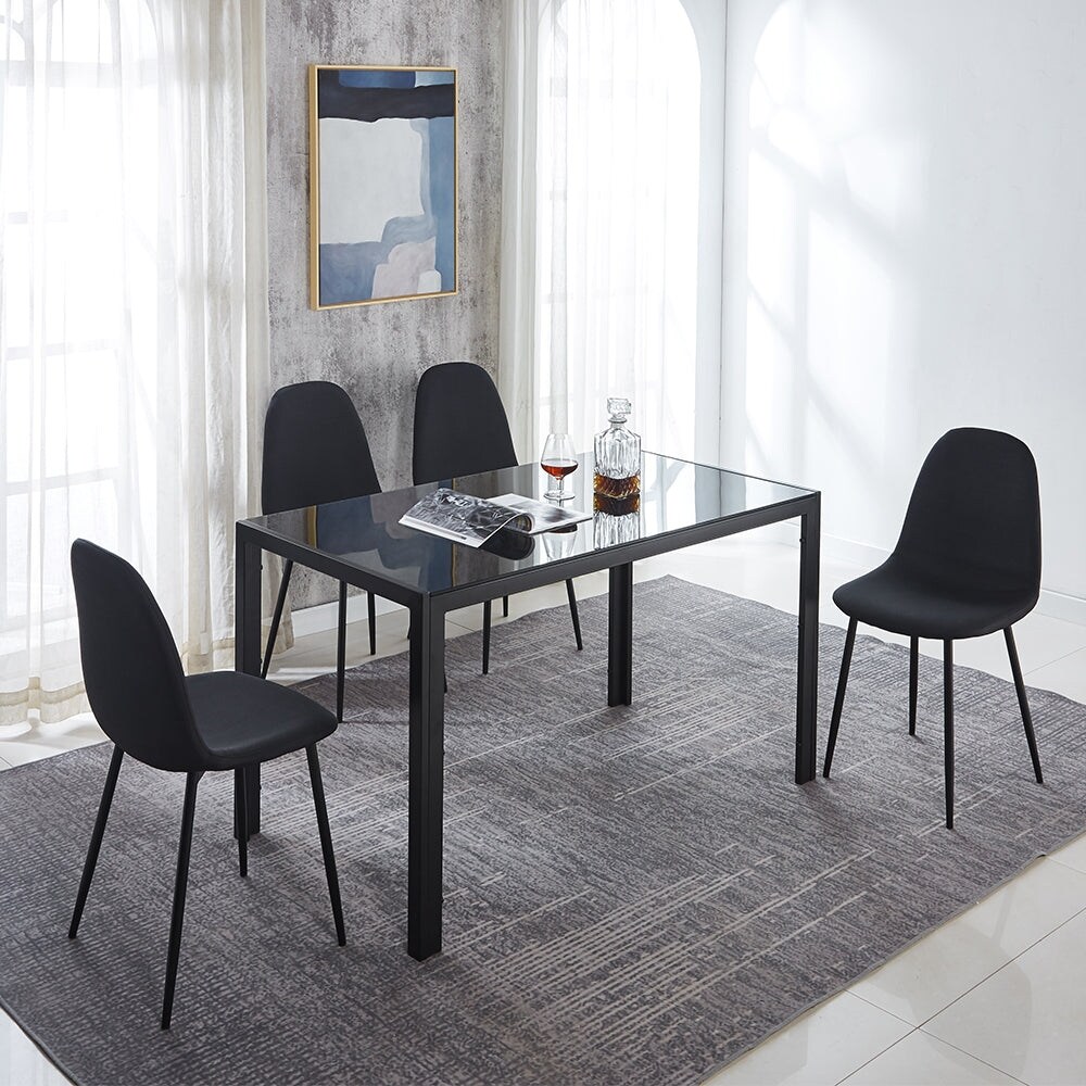 5 Piece Modern Black Glass Dining Set with Fabric Dining Chairs for 4