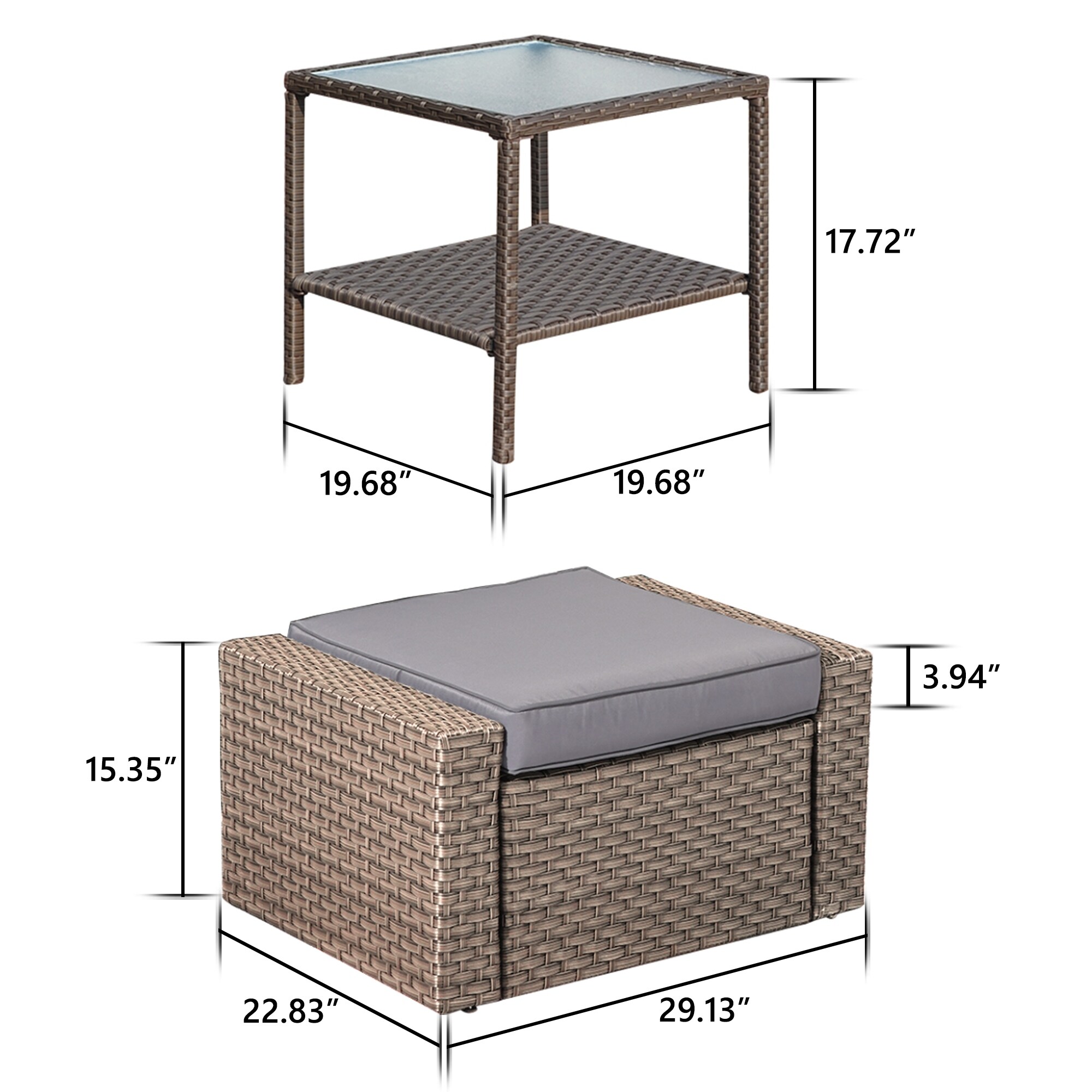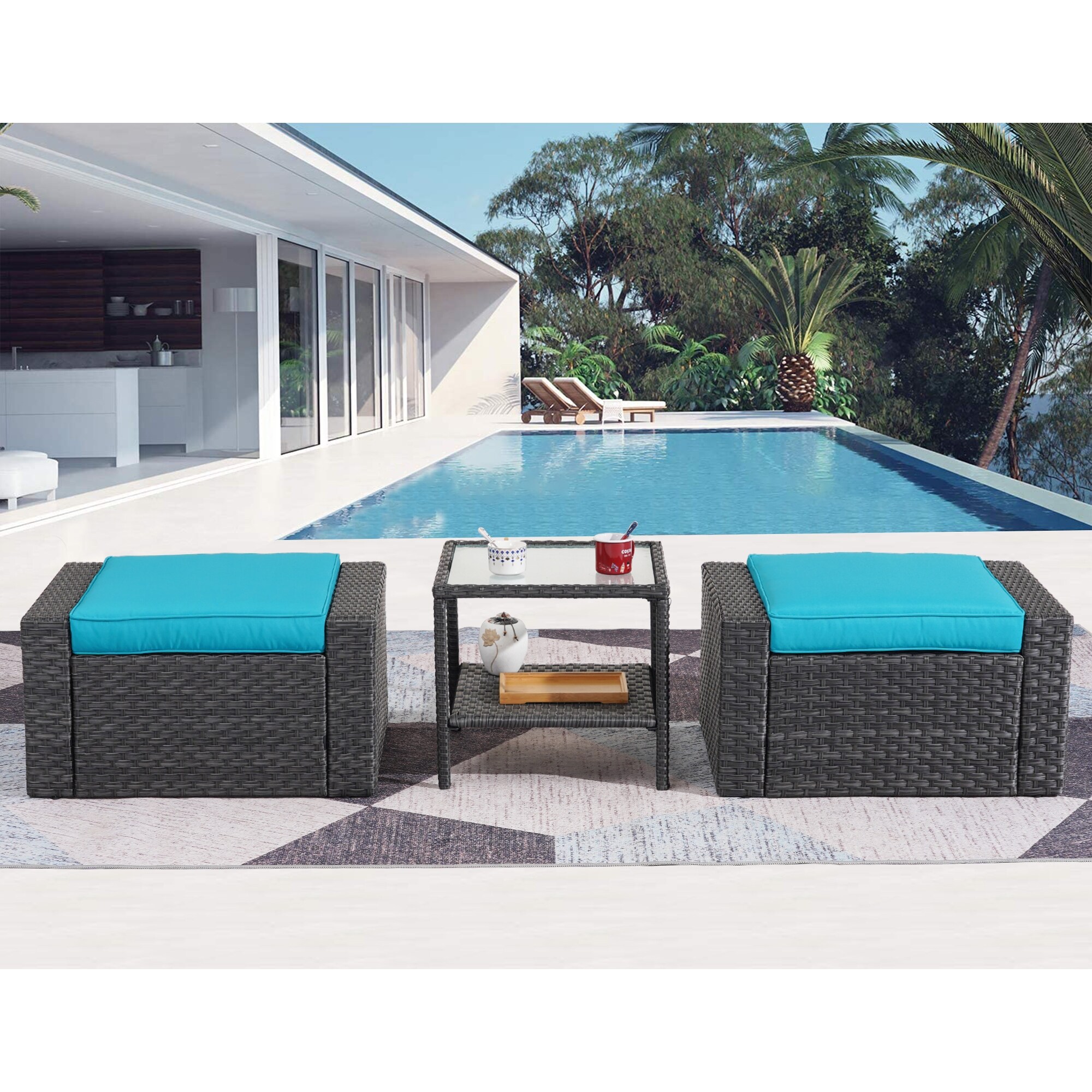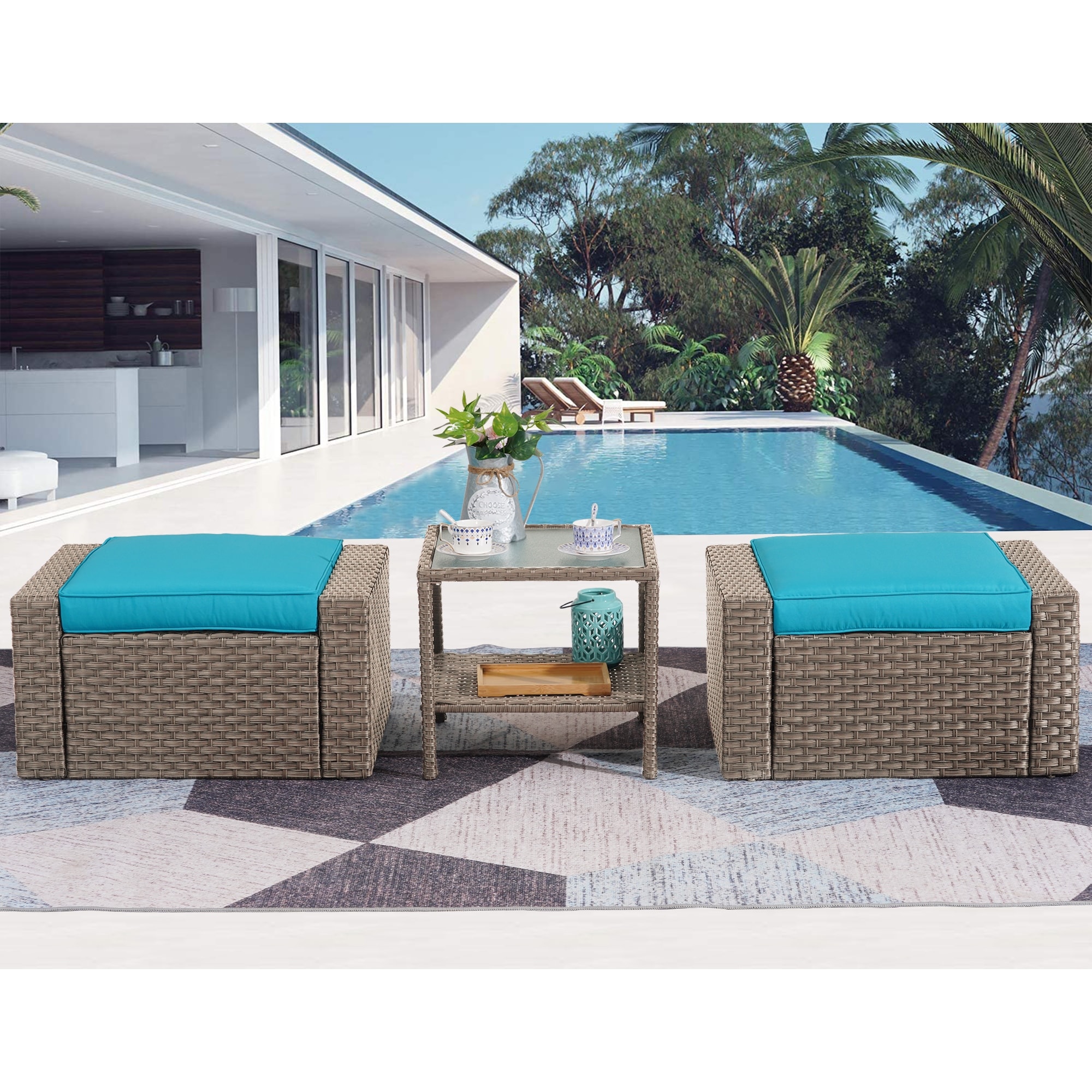 Modern 3 Piece Outdoor Ottomans with Glass Coffee Table