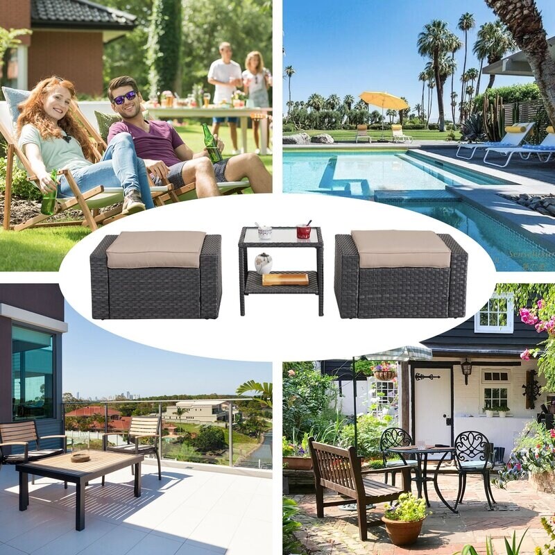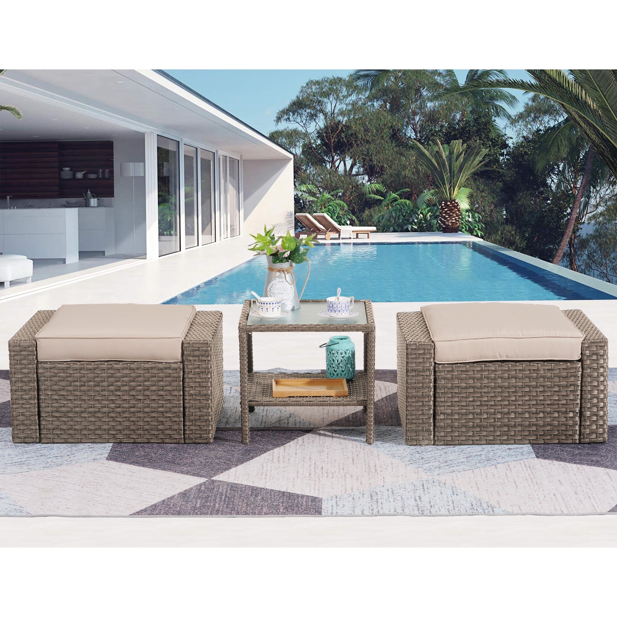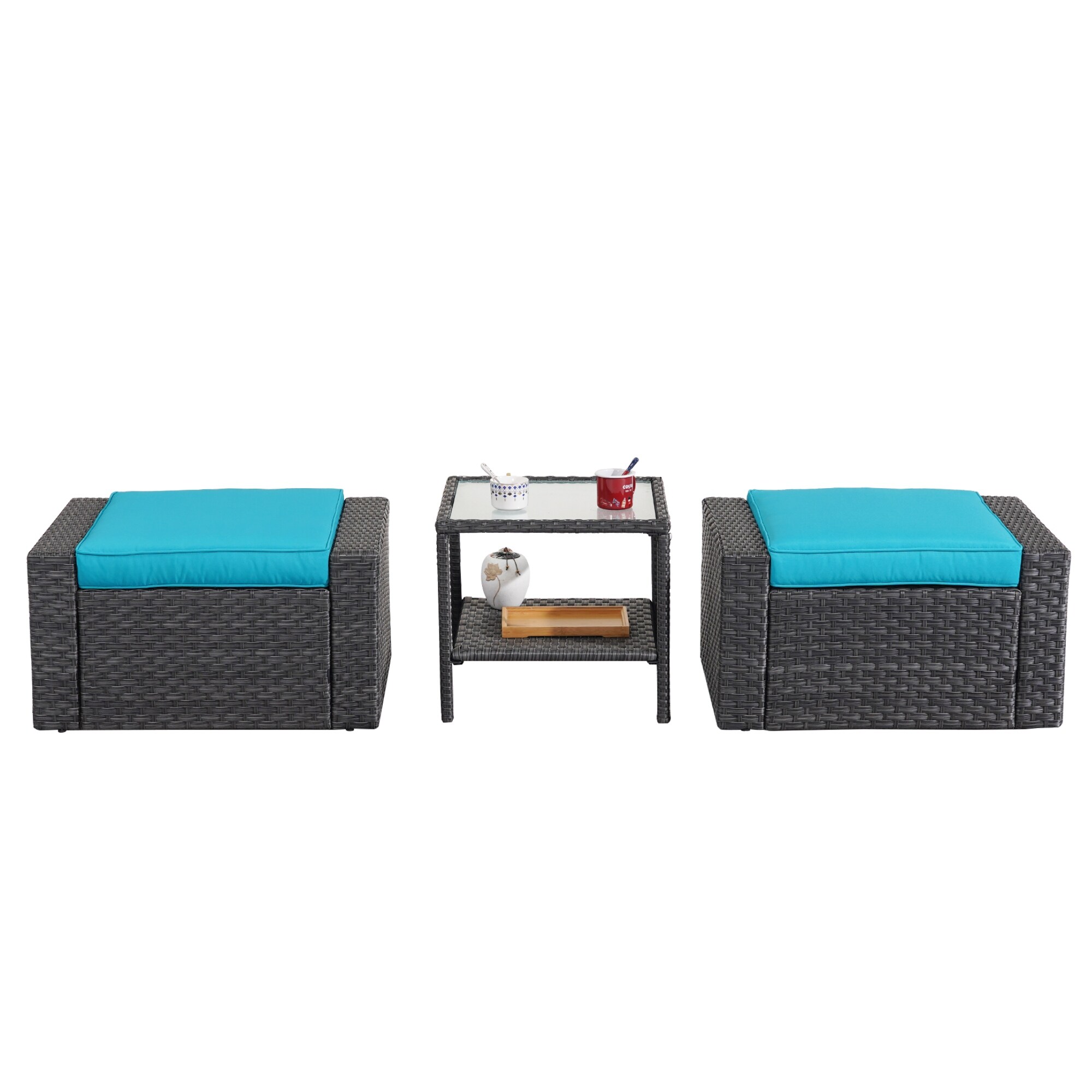 3 Piece Outdoor Ottomans with Glass Coffee Table