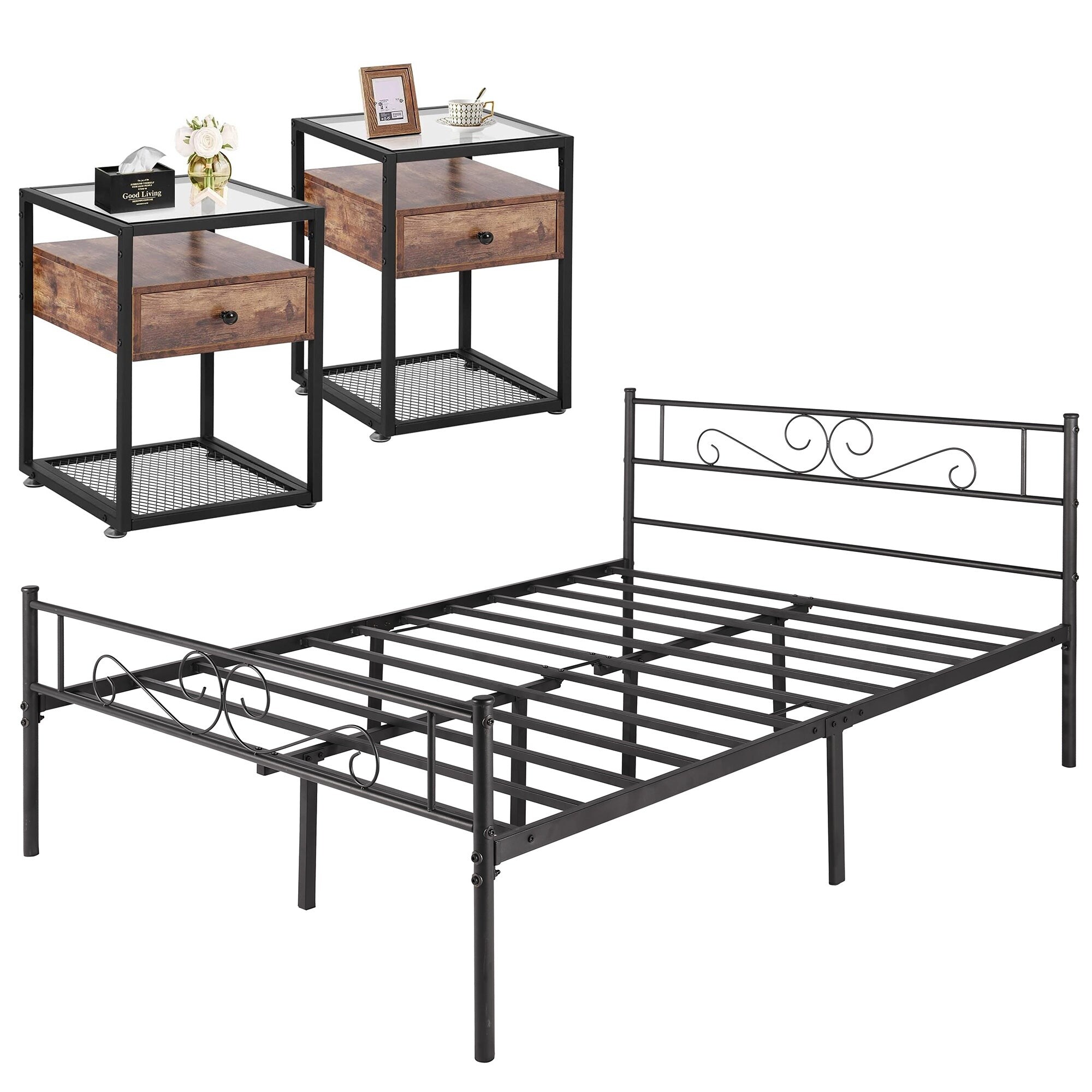 3-pieces Platform Bed Frame and Glass Top Nightstands Set of 2