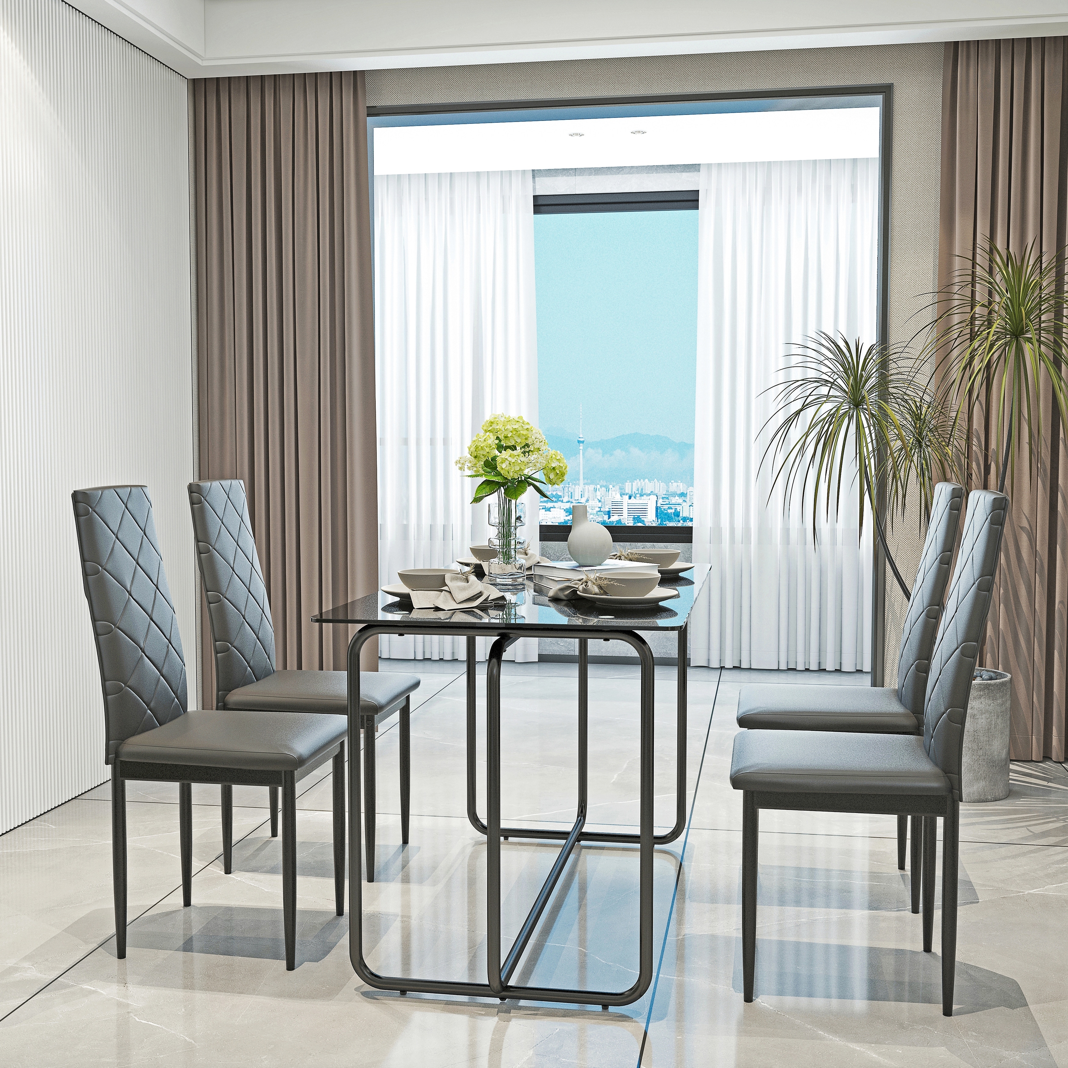 5-piece Metal Frame Rectangle Dining Table Set with Tempered Glass Tabletop Table & 4 Diamond Shaped PU Soft Leather Chairs