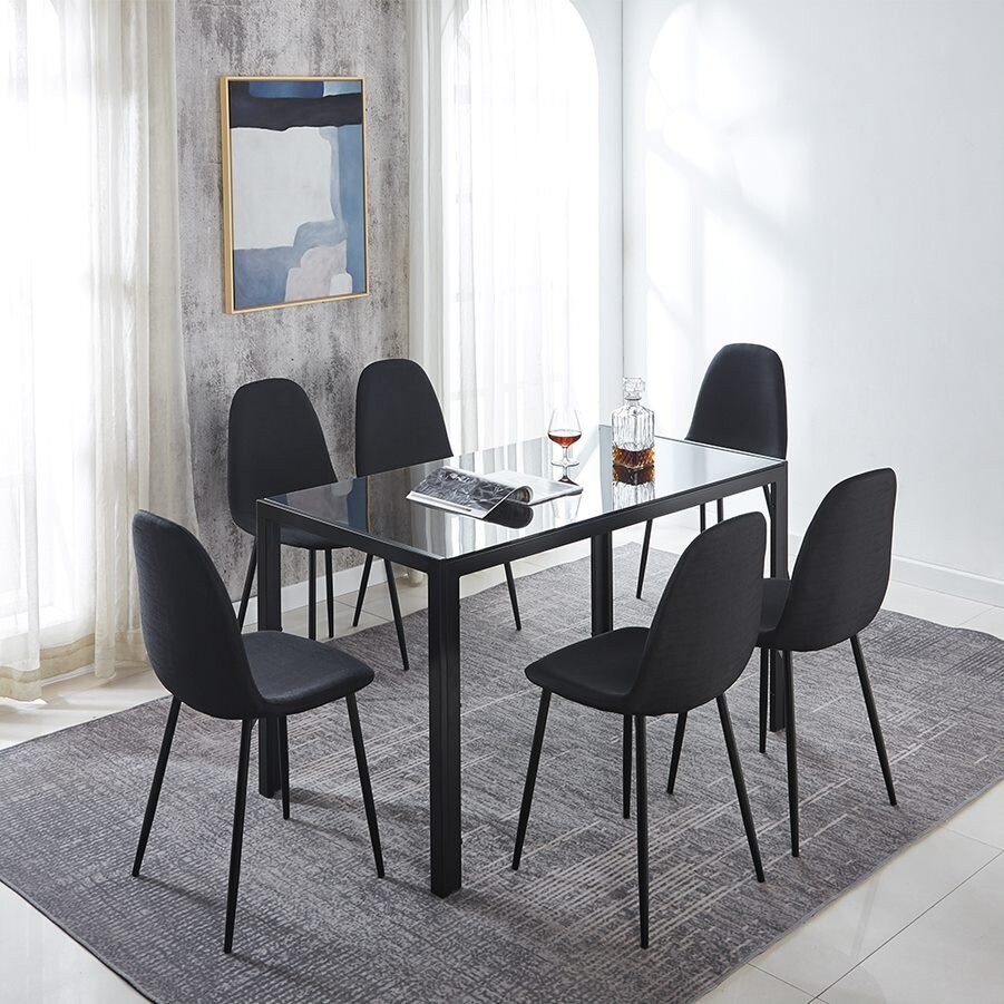 7 Piece Modern Black Glass Dining Set with Fabric Dining Chairs for 6