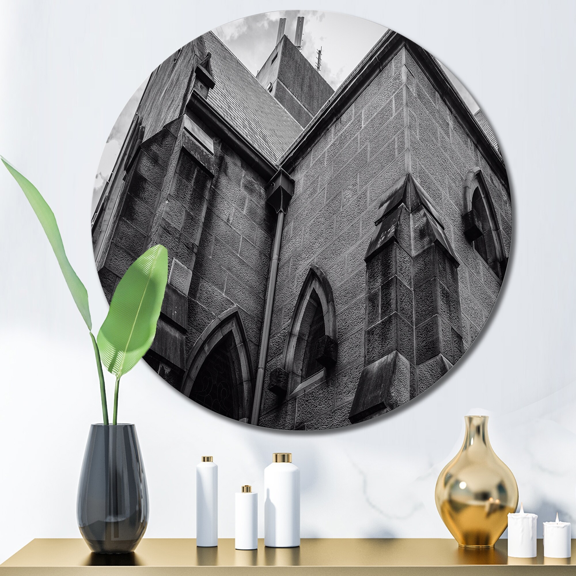 Designart 'Gothic Architecture Building in Black And White' Vintage Metal Circle Wall Art