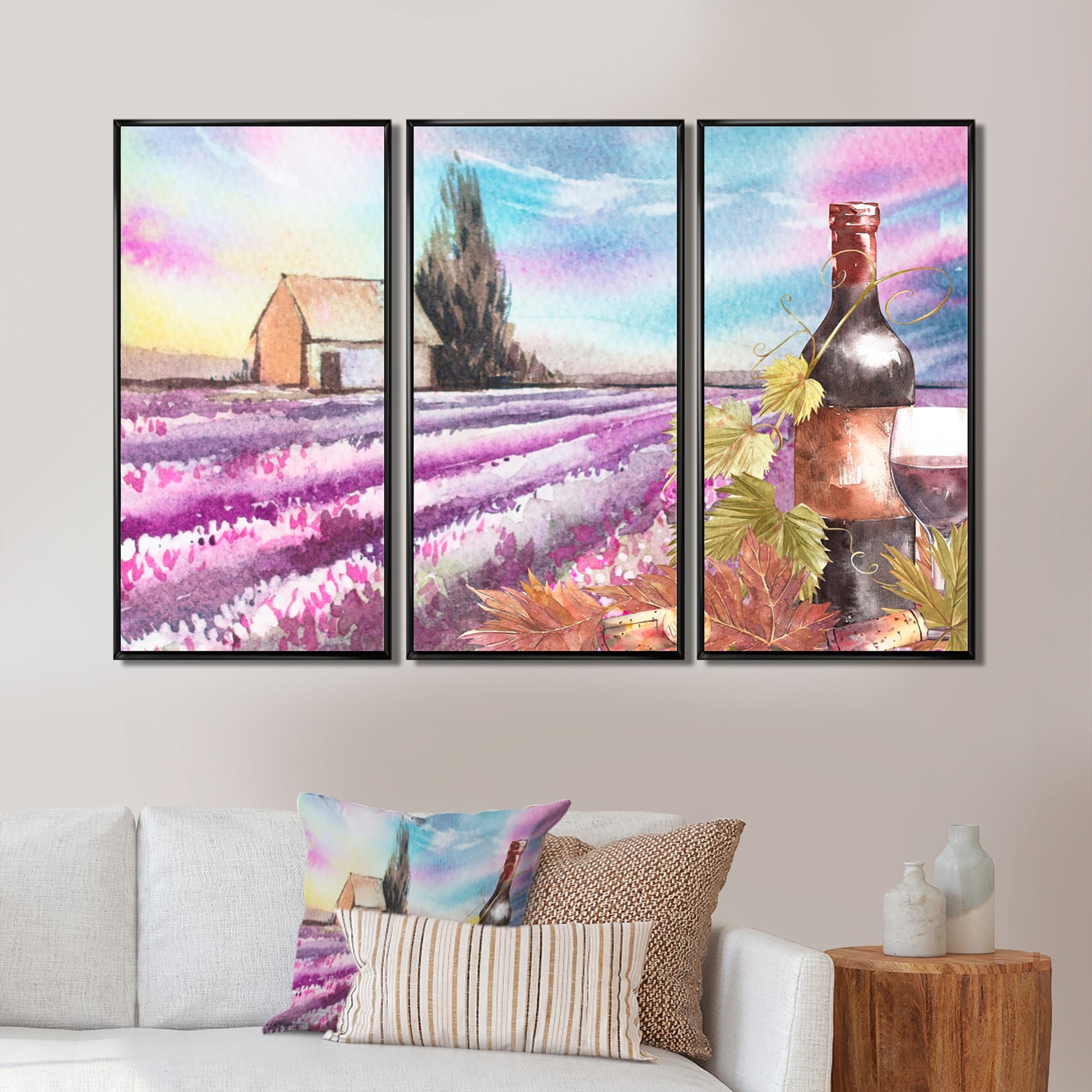 Designart "Bottles And Leaves of Grapes, A Lavender Field III" Country Framed Wall Decor Set of 3 - 4 Colors of Frames