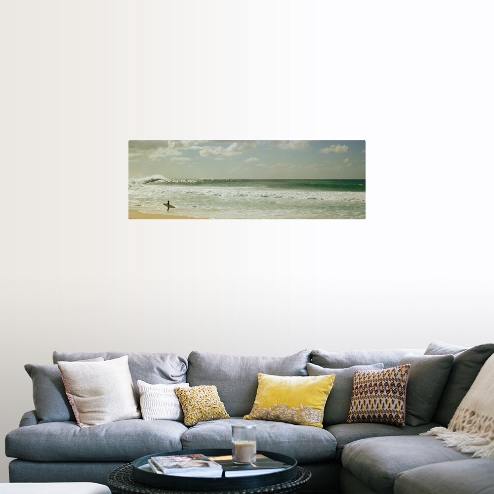 Easy Art Prints Panoramic Images's 'Surfer standing on the beach, North Shore, Oahu, Hawaii, USA' Premium Canvas Art