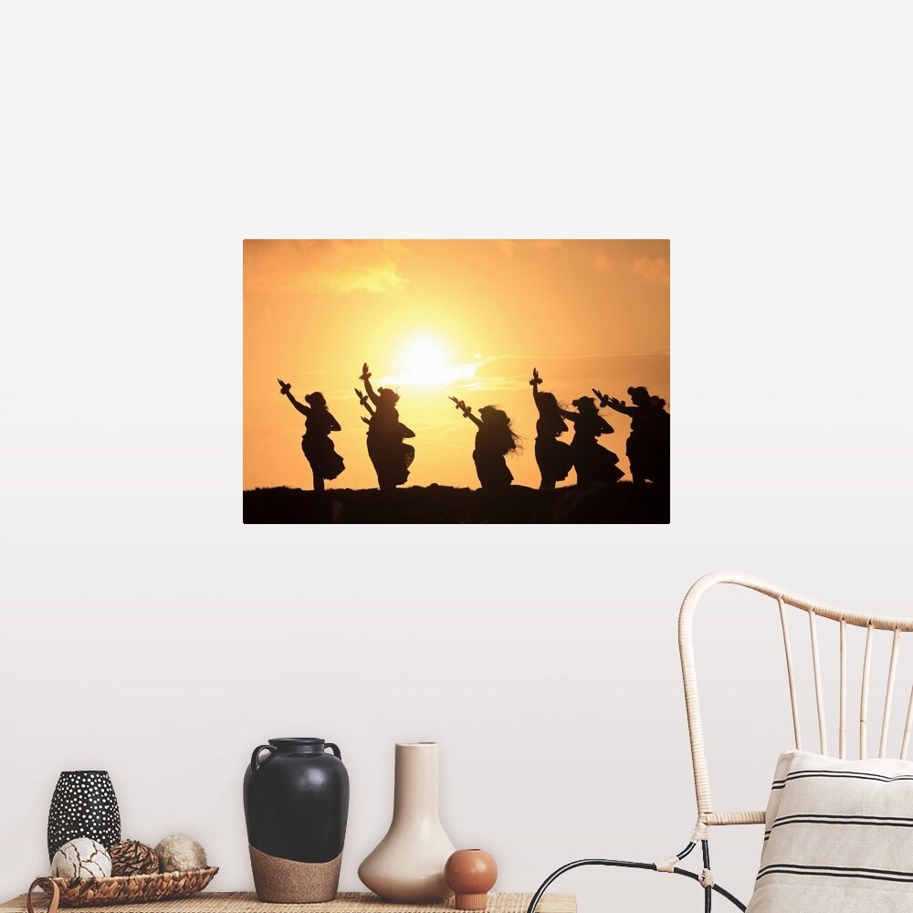 "Silhouette of hula dancers at sunrise Molokai Hawaii" Poster Print - Multi