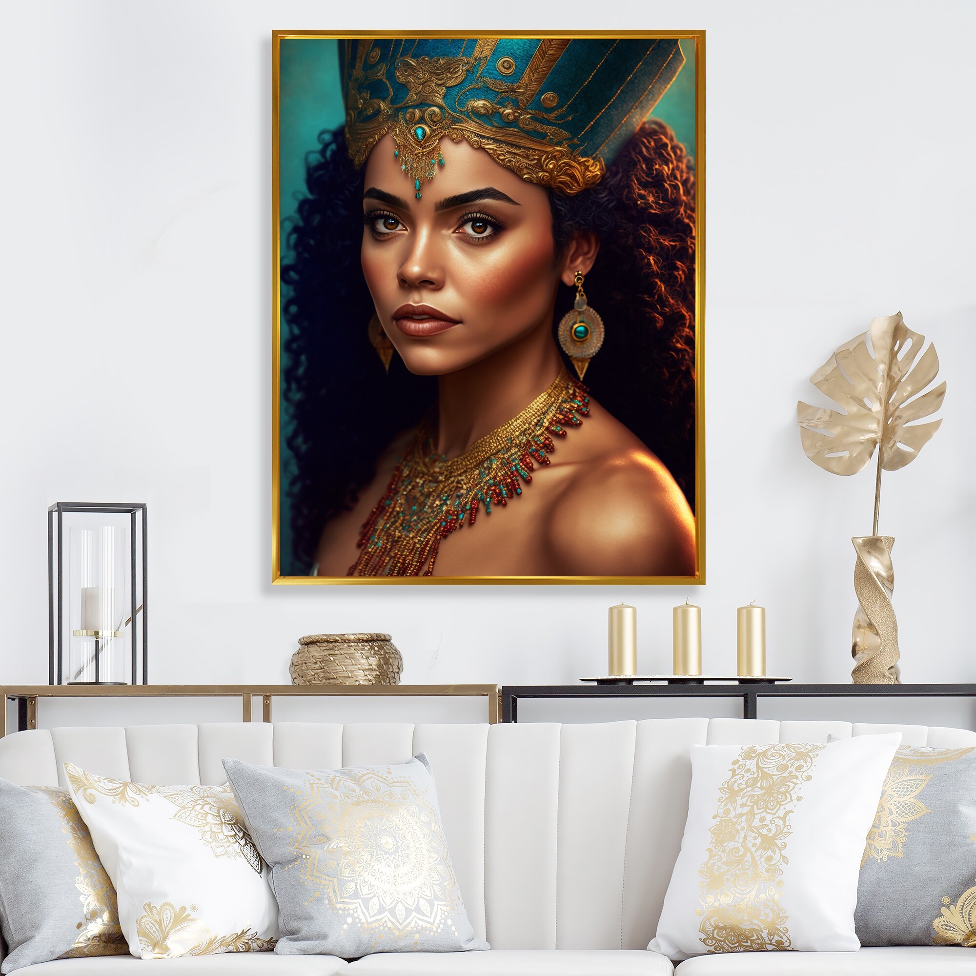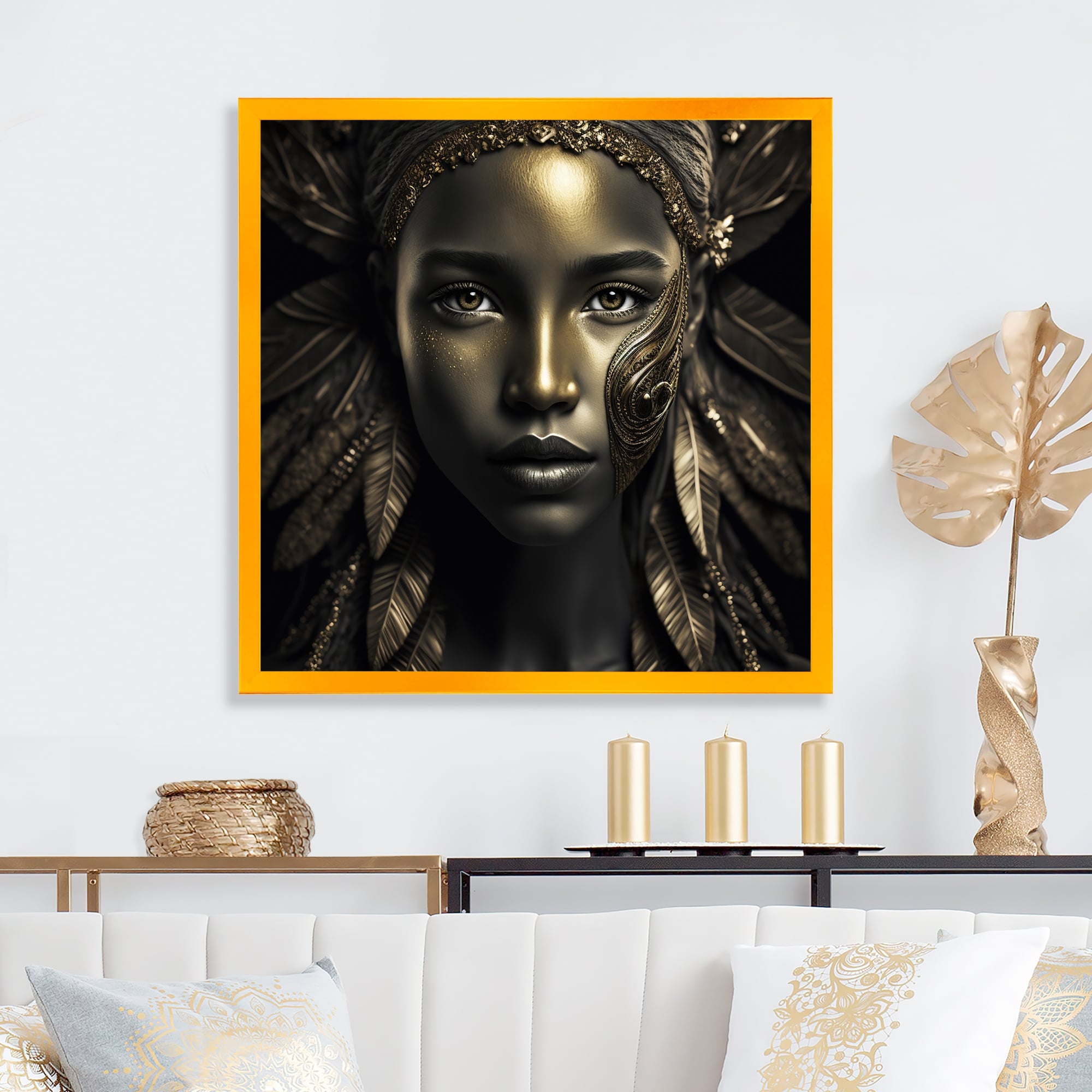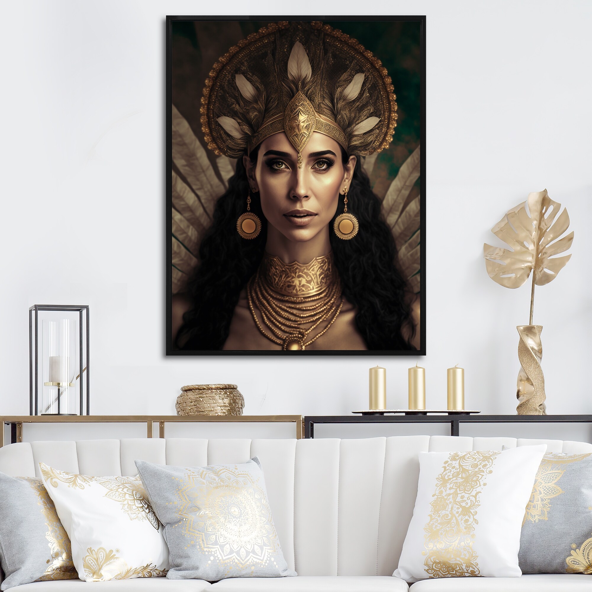 Designart "Bohemian Woman Traditional Headdress Vintage Gold IV" Boho Woman Framed Canvas Wall Art Print