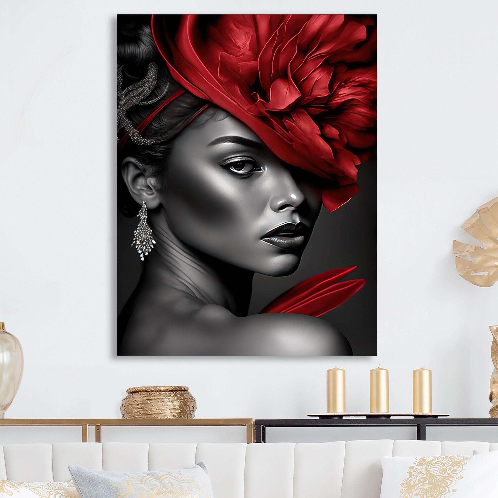 "Pretty Floral Design", Classic Flower Headdress Glam White Canvas Wall Art Print for Bedroom