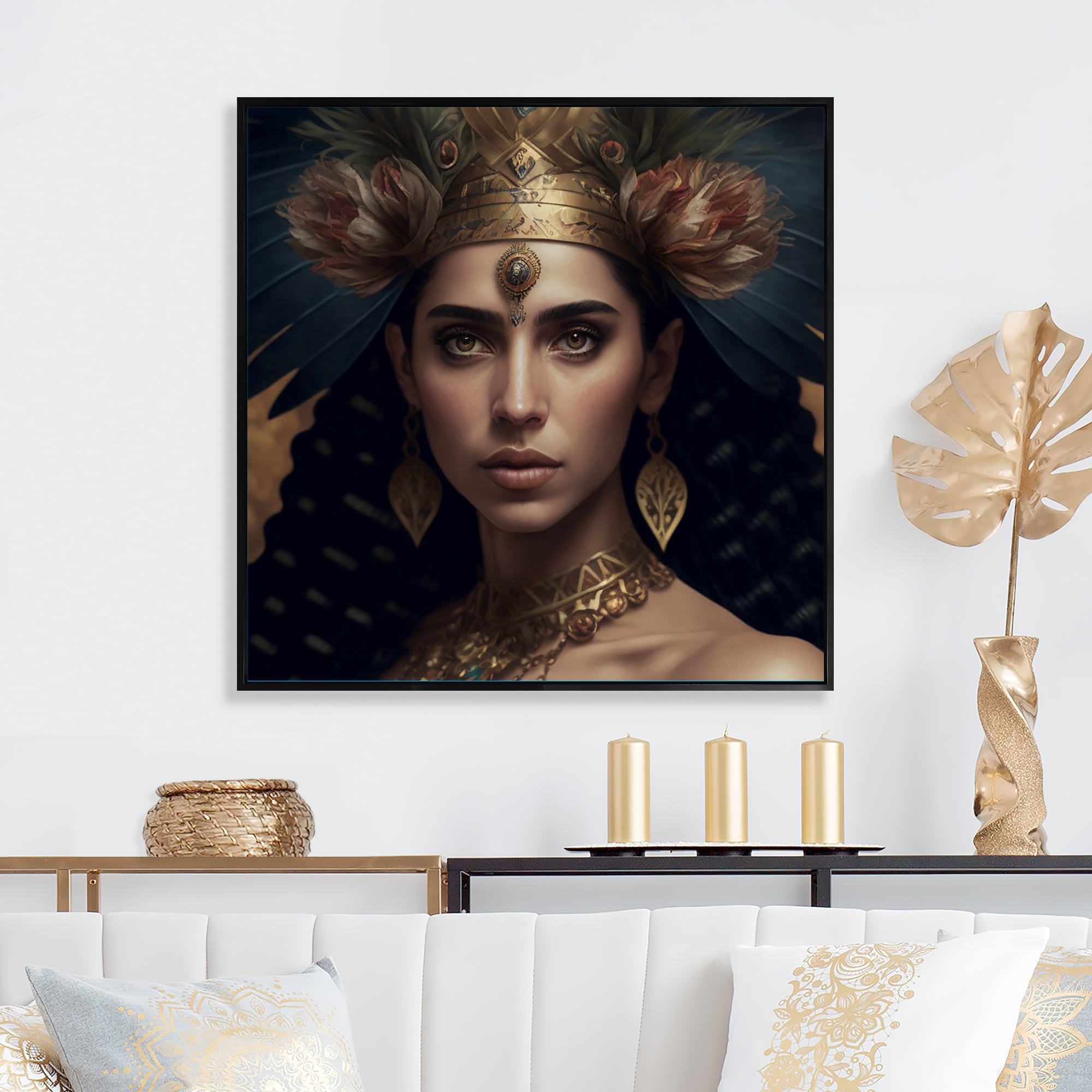 Designart "Bohemian Woman Traditional Headdress Vintage Gold V" Boho Woman Framed Canvas Wall Art Print