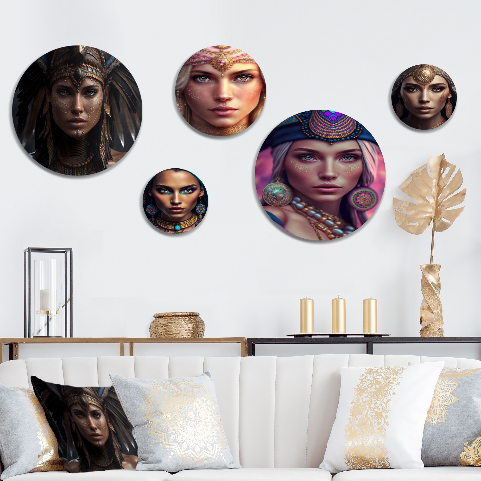 Designart "Bohemian Woman With Feather Headdress I" Boho Woman Metal Wall Art Set of 5