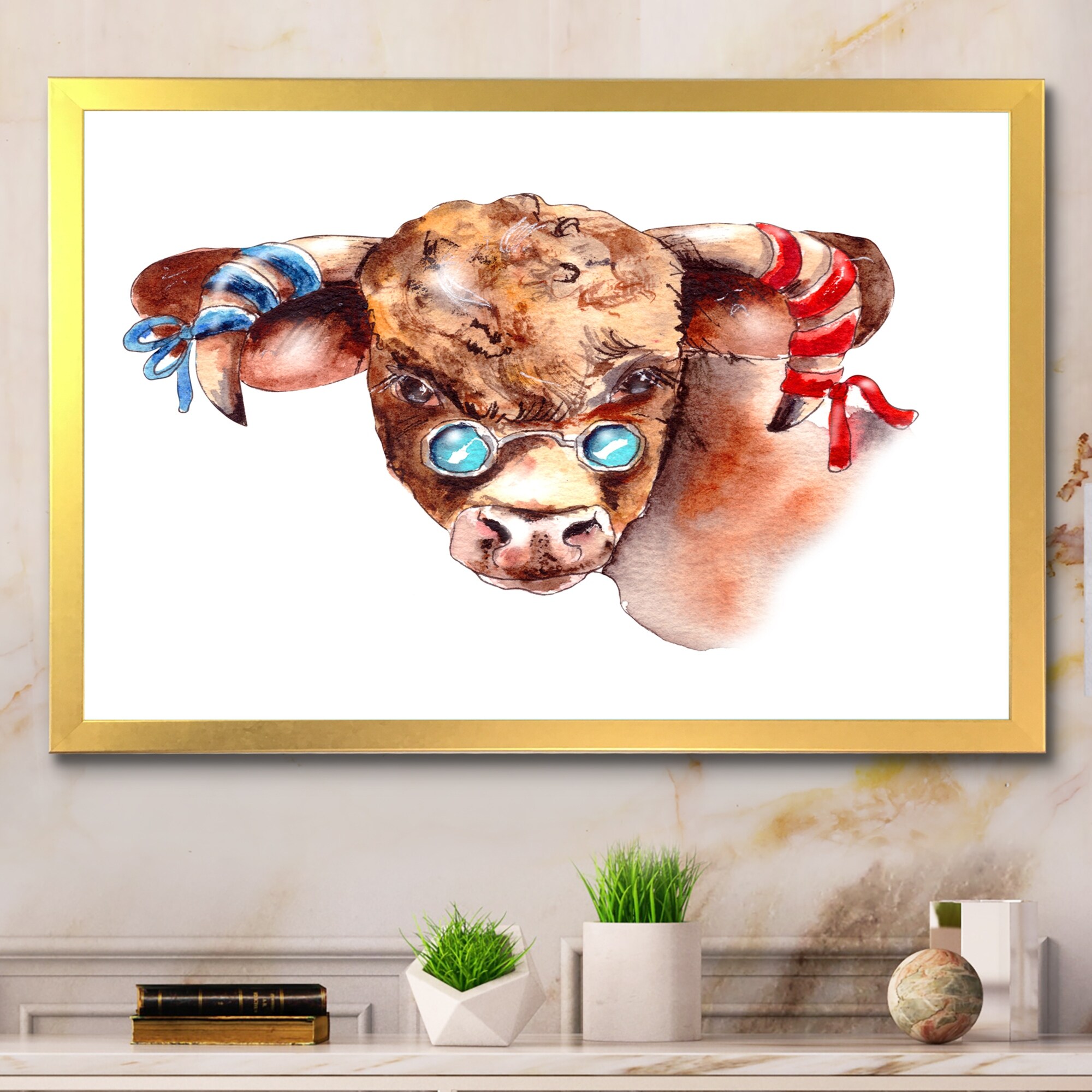 Designart "Carton Hipster Bull Portrait" Children's Art Framed Art Print