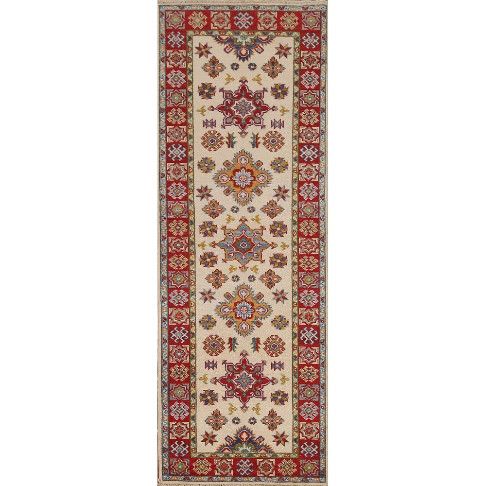 Ivory Geometric Kazak Oriental Runner Rug Hand-knotted Wool Carpet - 2'7" x 8'0"