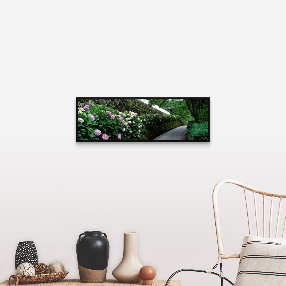 "Old Wall with Hydrangea Hasedera-sando Sakurai Nara Japan" Black Float Frame Canvas Art