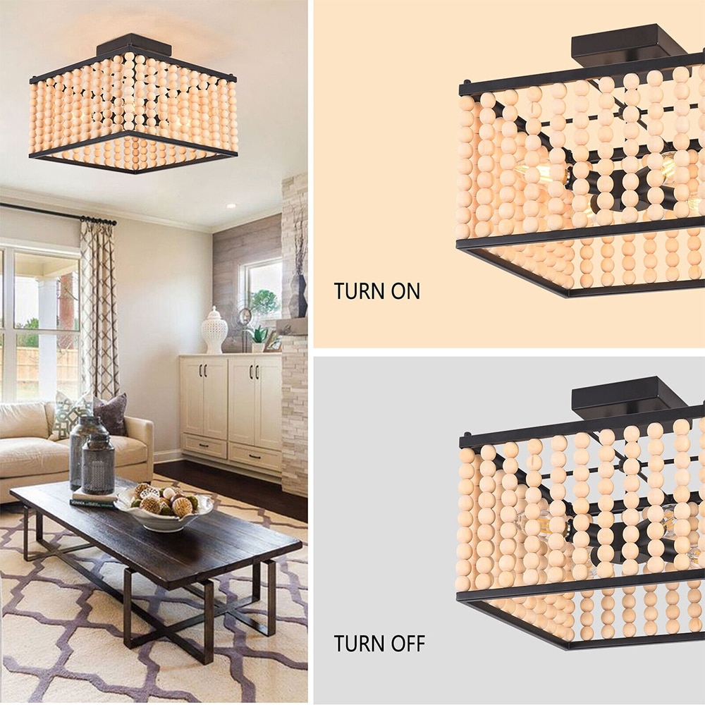 4 Lights Wood Beaded Ceiling Lamp Fixture Vintage Boho Chandelier - 7" x 13"