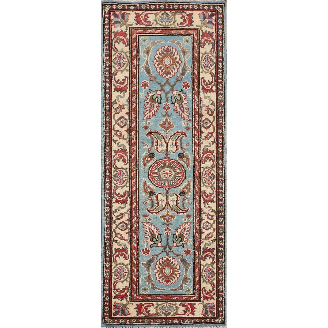 Light Blue Kazak Oriental Runner Rug Hallway Hand-Knotted Wool Carpet - 2'1" x 5'9"