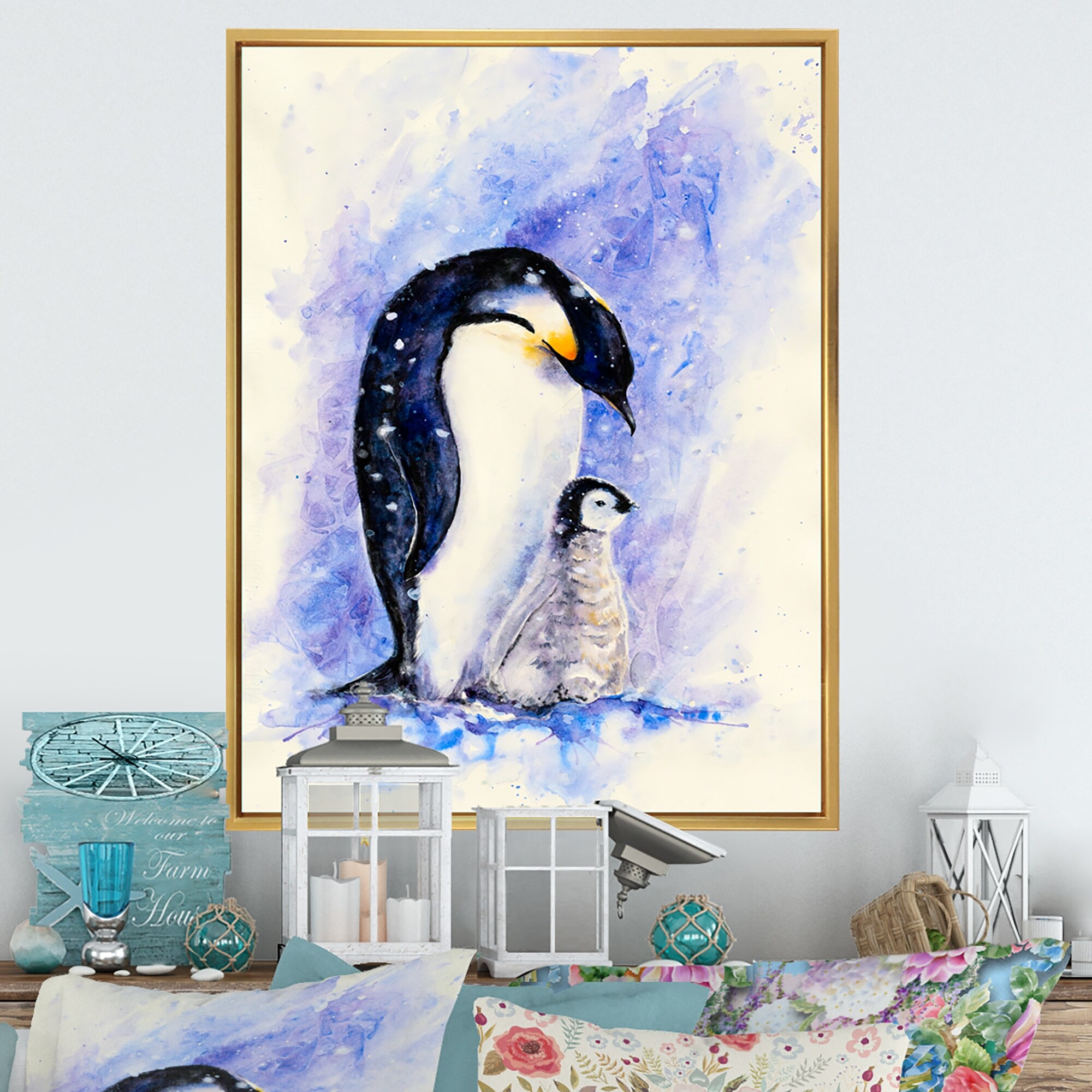 Designart "Royal Penguins Mom With Her Baby" Traditional Framed Canvas artwork