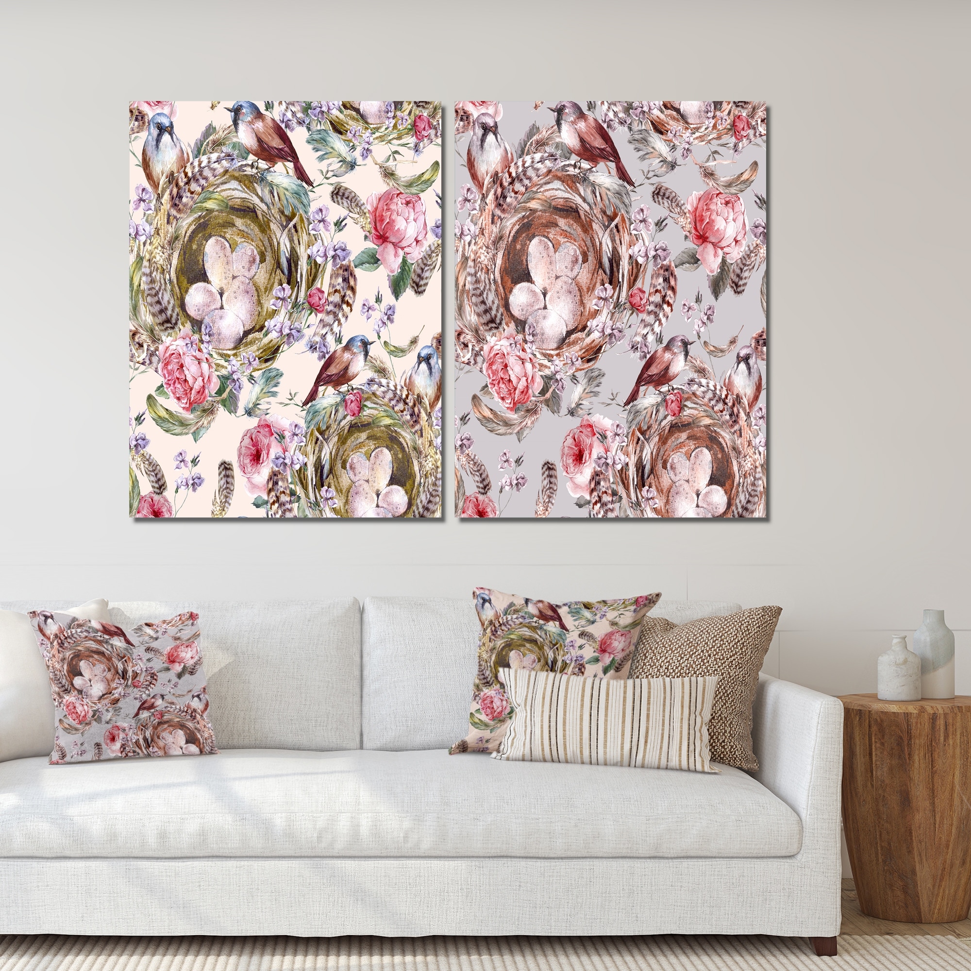 Designart 'Vintage Pattern With Rose Birds Nests, Feathers' Patterned Art Set of 2 Pieces