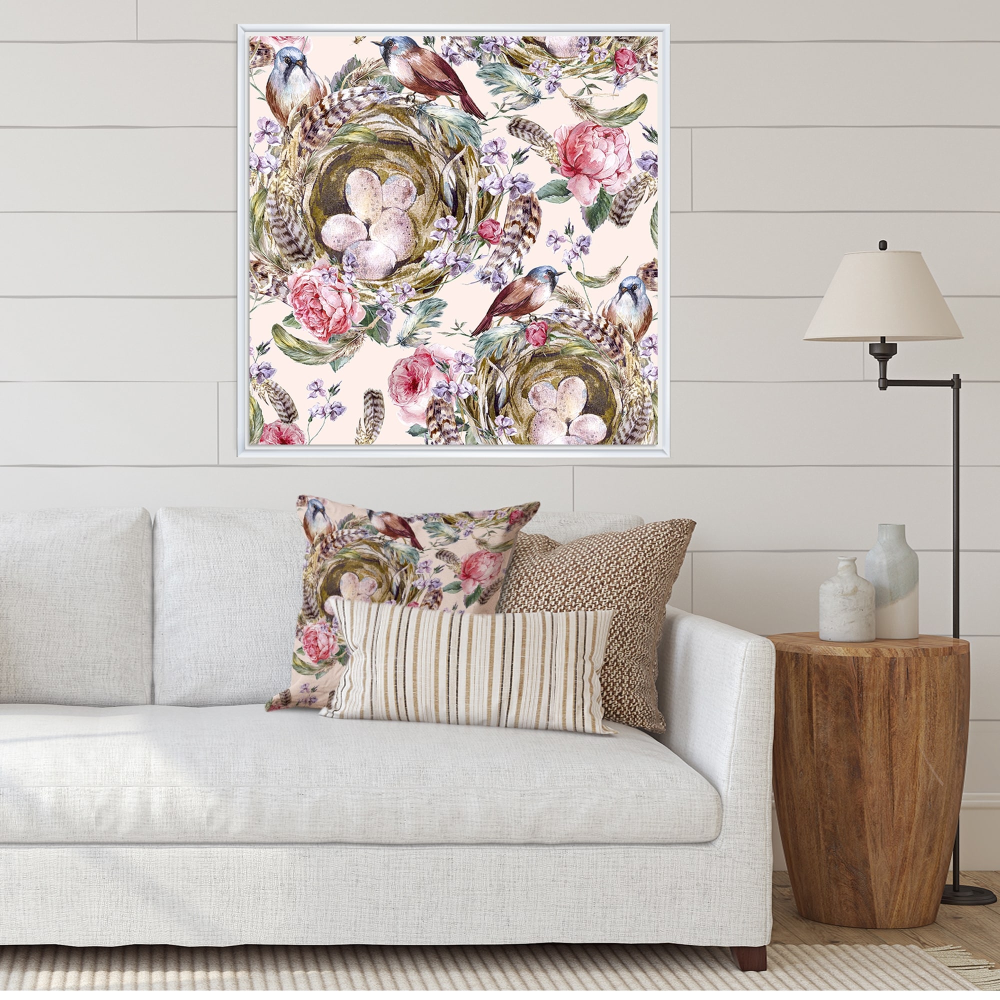 Designart "Vintage Pattern With Rose Birds Nests, Feathers" Patterned Framed Canvas Wall Art Print
