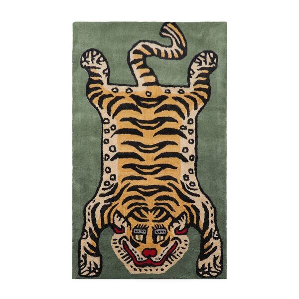 Hand Tufted Hand Made Wool Tiger Novelty Oriental Area Rug Celadon - 3' x 5'