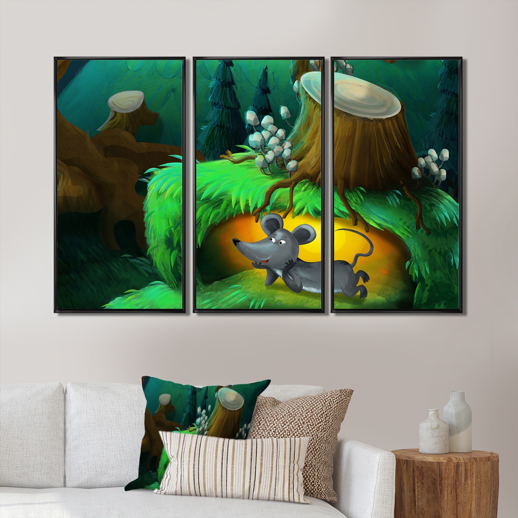 Designart "Little Mouse Under Tree for Fantasy Story" Novelty Framed Art Prints Set of 3 - 4 Colors of Frames