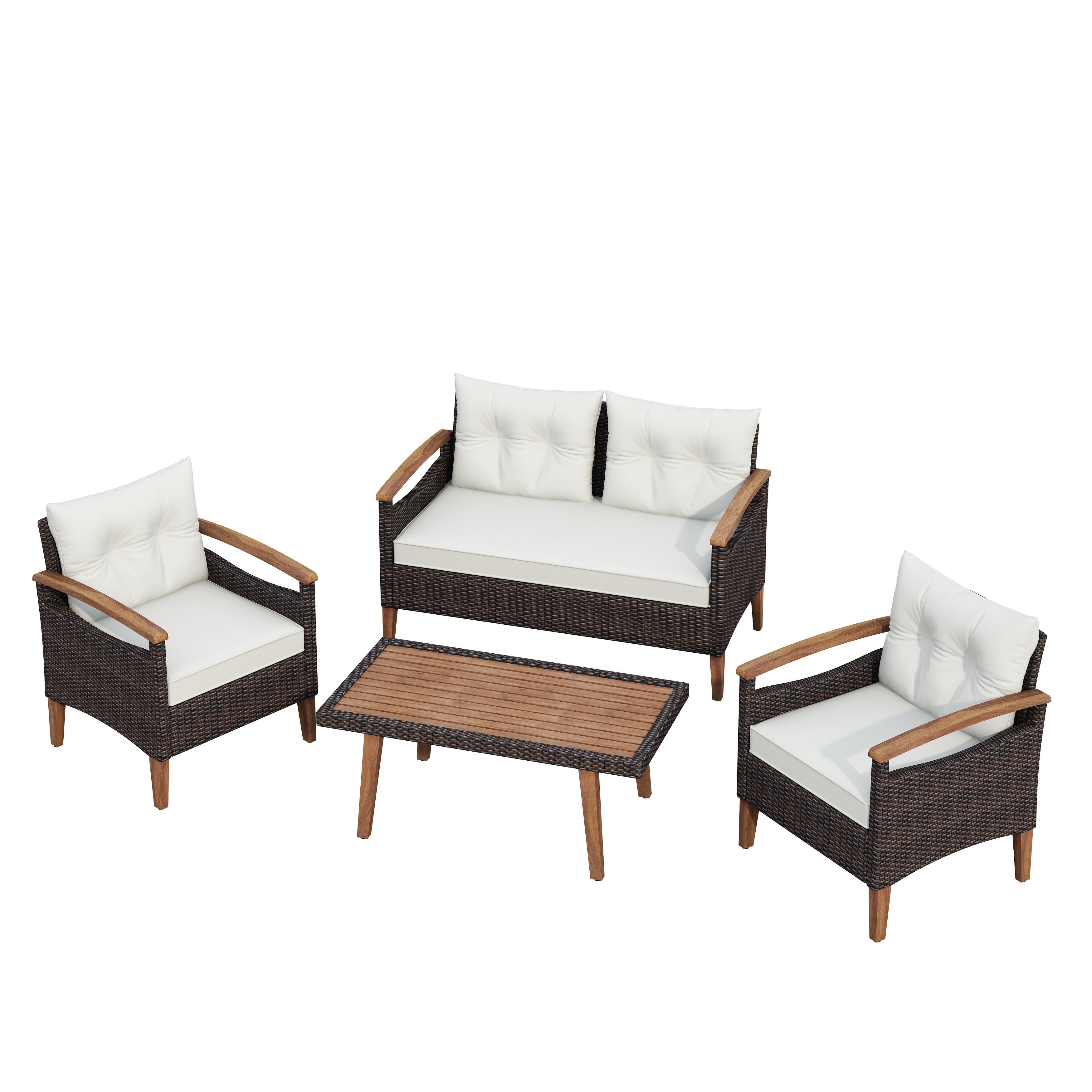 4-Piece Patio Seating Set,PE Rattan Outdoor Sofa Set,Wood Table