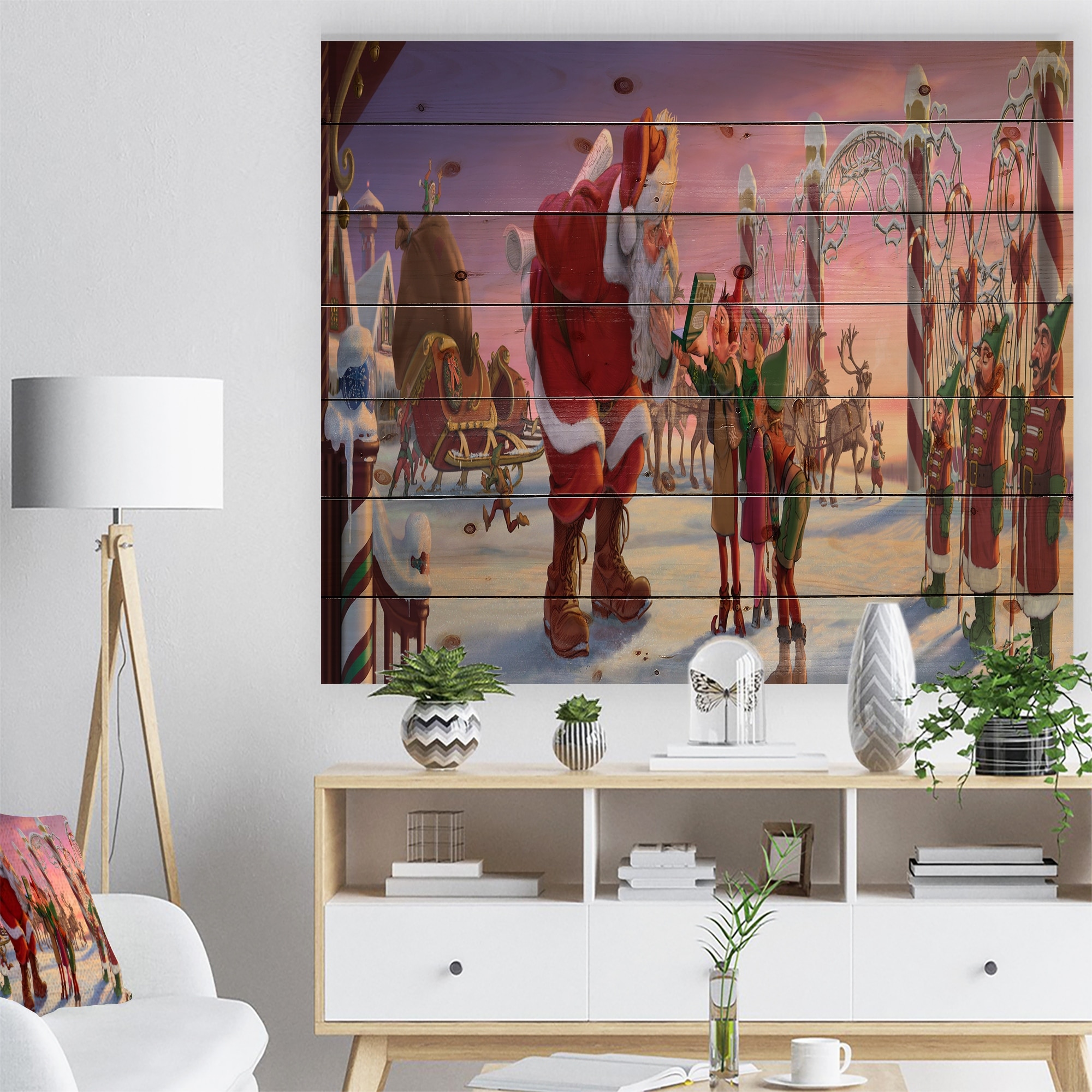 Designart 'Stanta Claus with Elves on North Pole' Print on Natural Pine Wood - Red