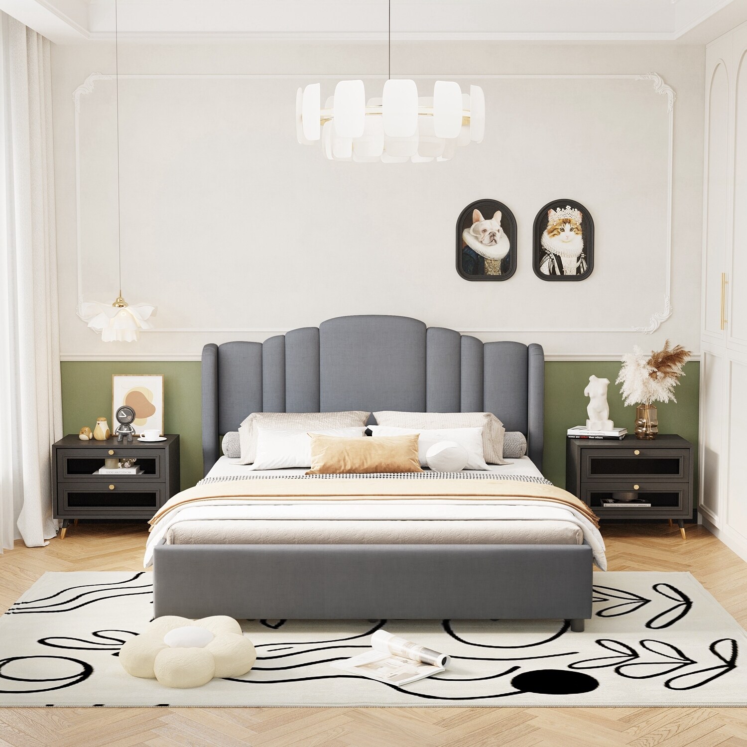 Queen Upholstered Platform Bed with Wingback Headboard & 4 Drawers