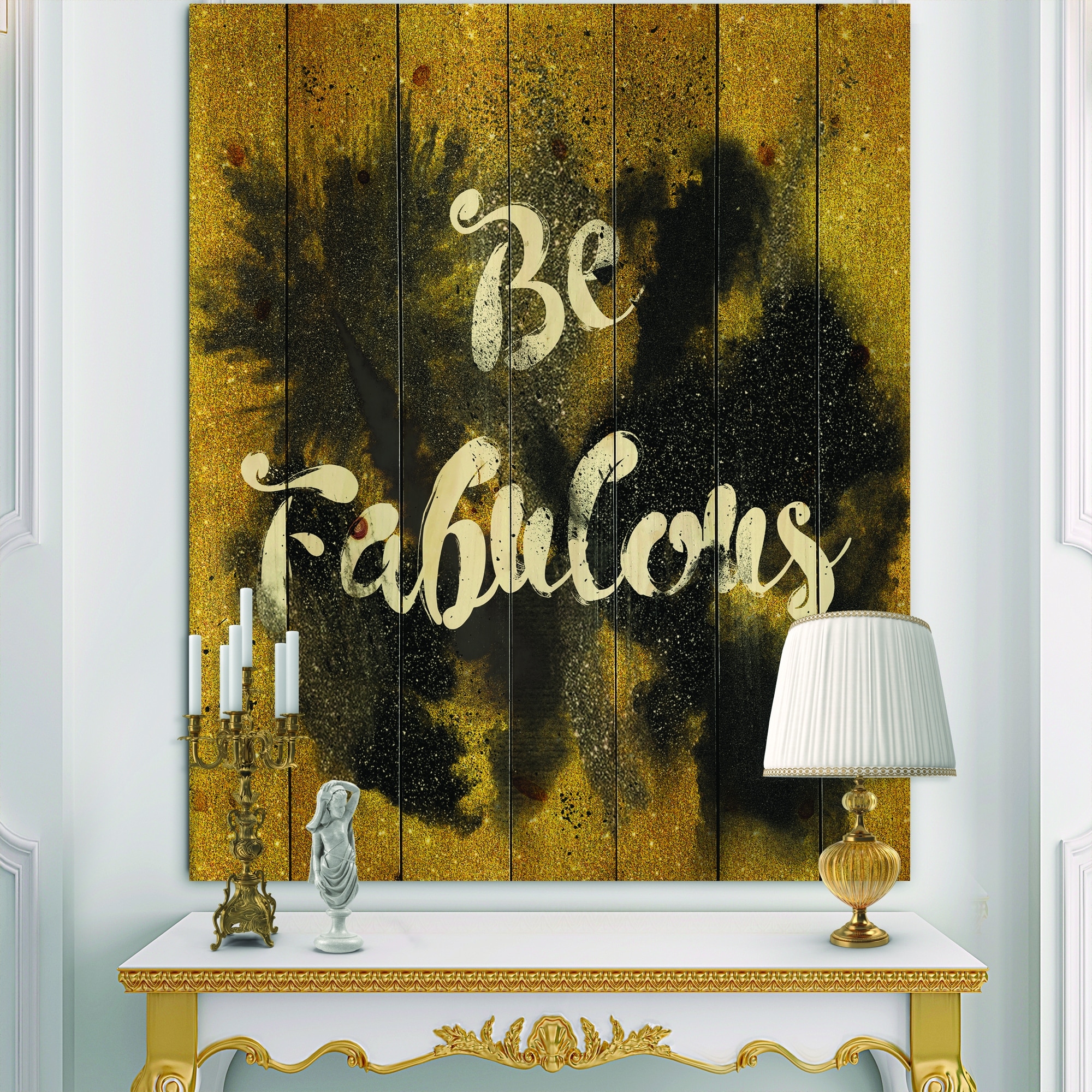 Designart 'Be Fabulous Quote Black on Gold' Fashion Print on Natural Pine Wood