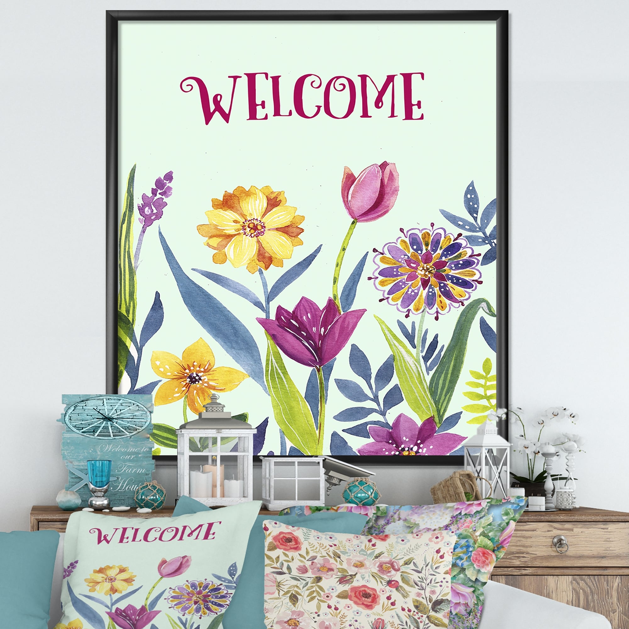 Designart "Welcome Flower Quote" Cottage Framed Art Print