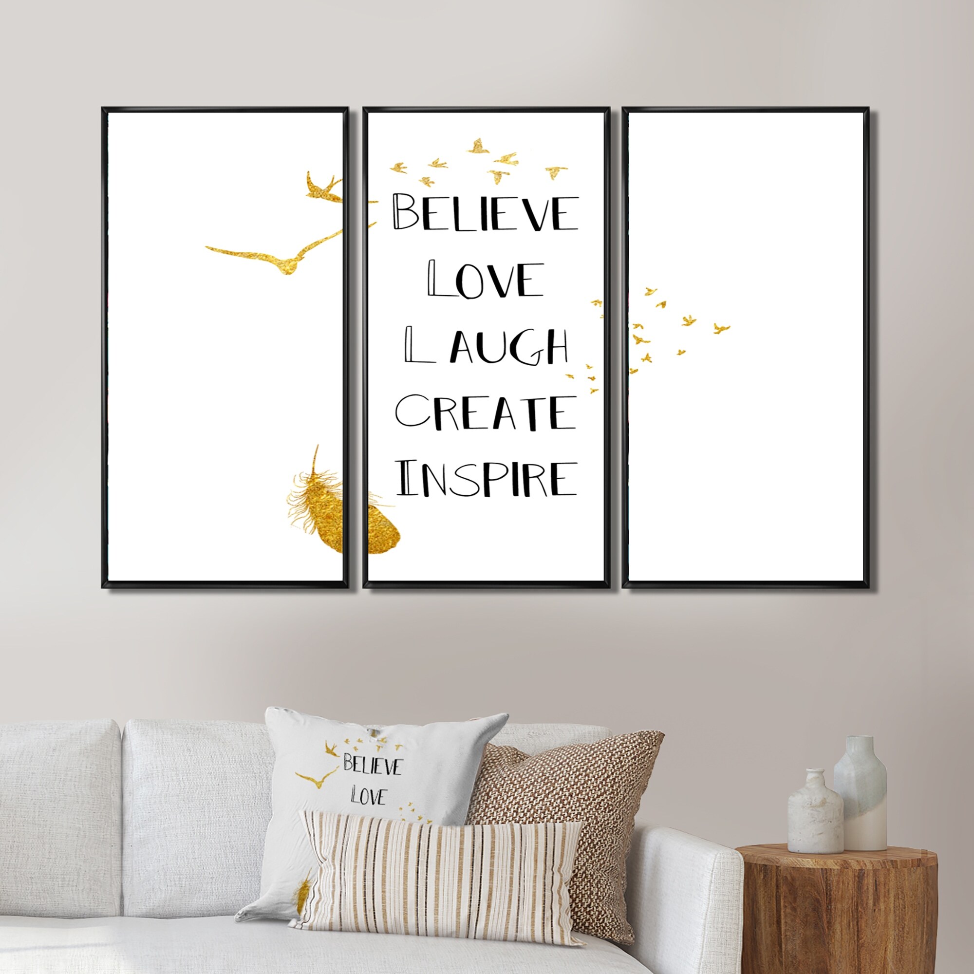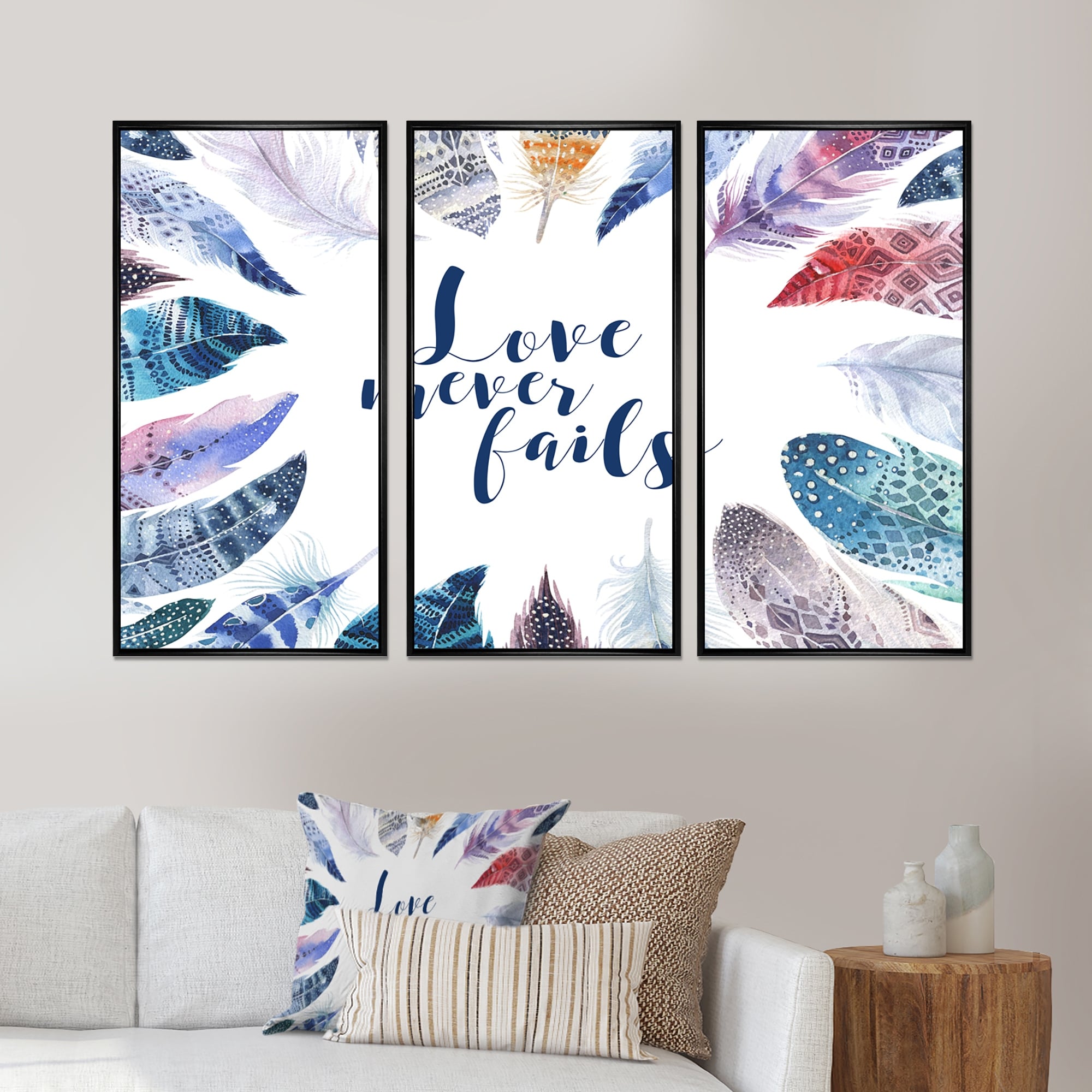 Designart "Boho Feathers With Inspiring Quote" Bohemian & Eclectic Framed Canvas Wall Art Set of 3 - 4 Colors of Frames