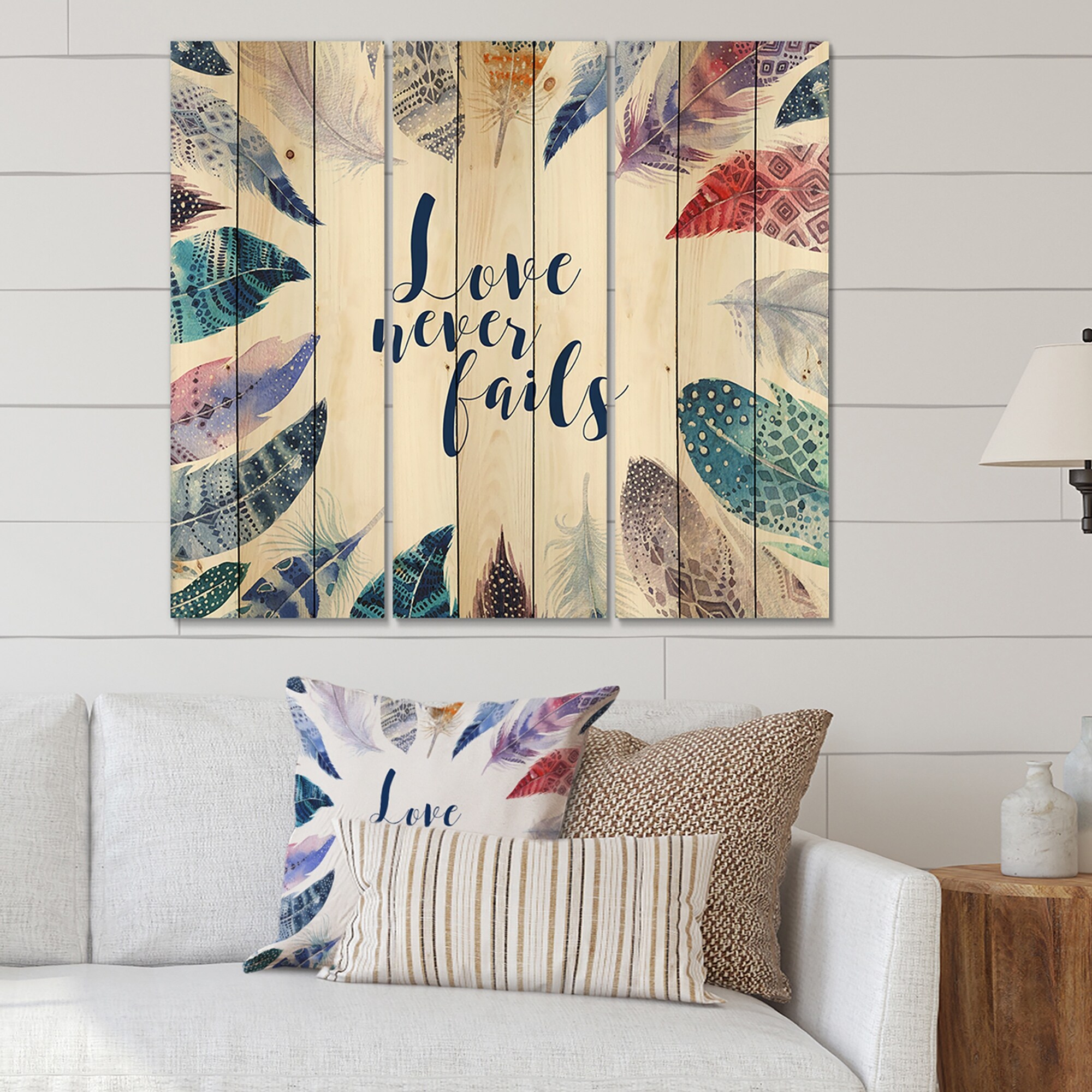 Designart 'Boho Feathers With Inspiring Quote' Bohemian & Eclectic Print on Natural Pine Wood - 3 Panels