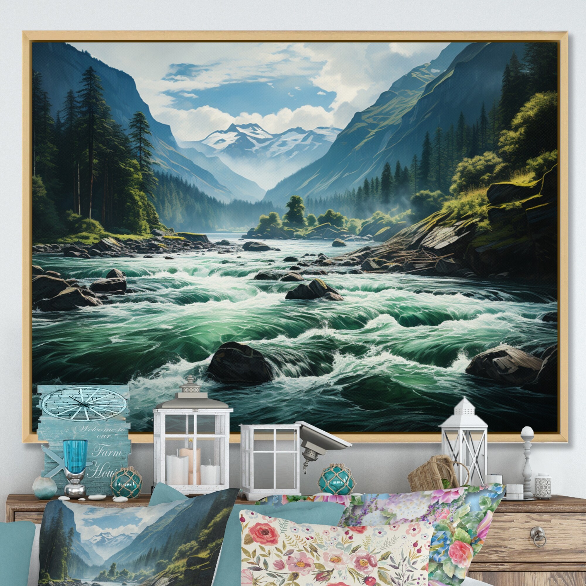 Designart "Teal River Silvery Waters" Lakes & Rivers Framed Canvas Prints