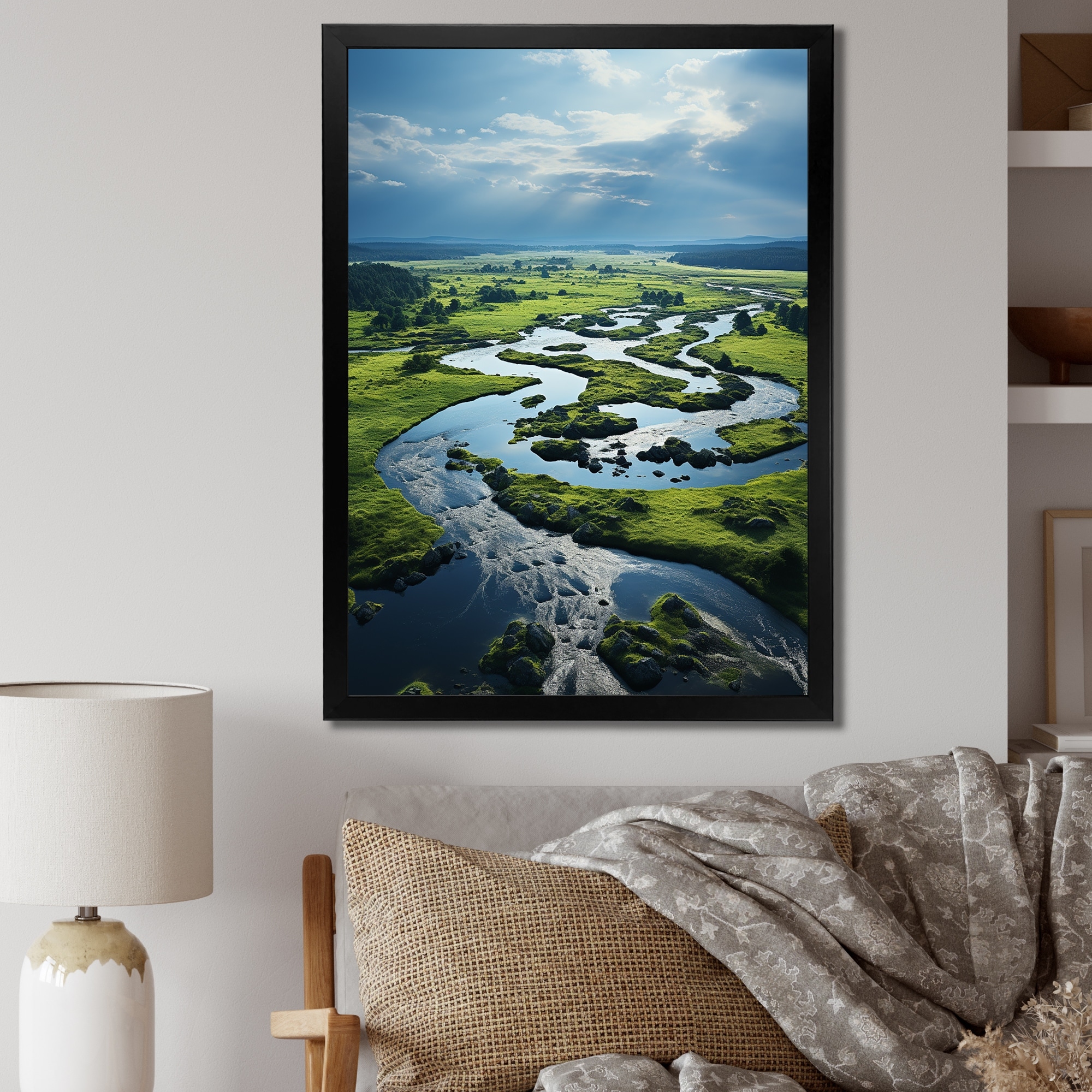 Designart "Meandering River Through Marshland I" Landscape Lake River Framed Wall Art Prints