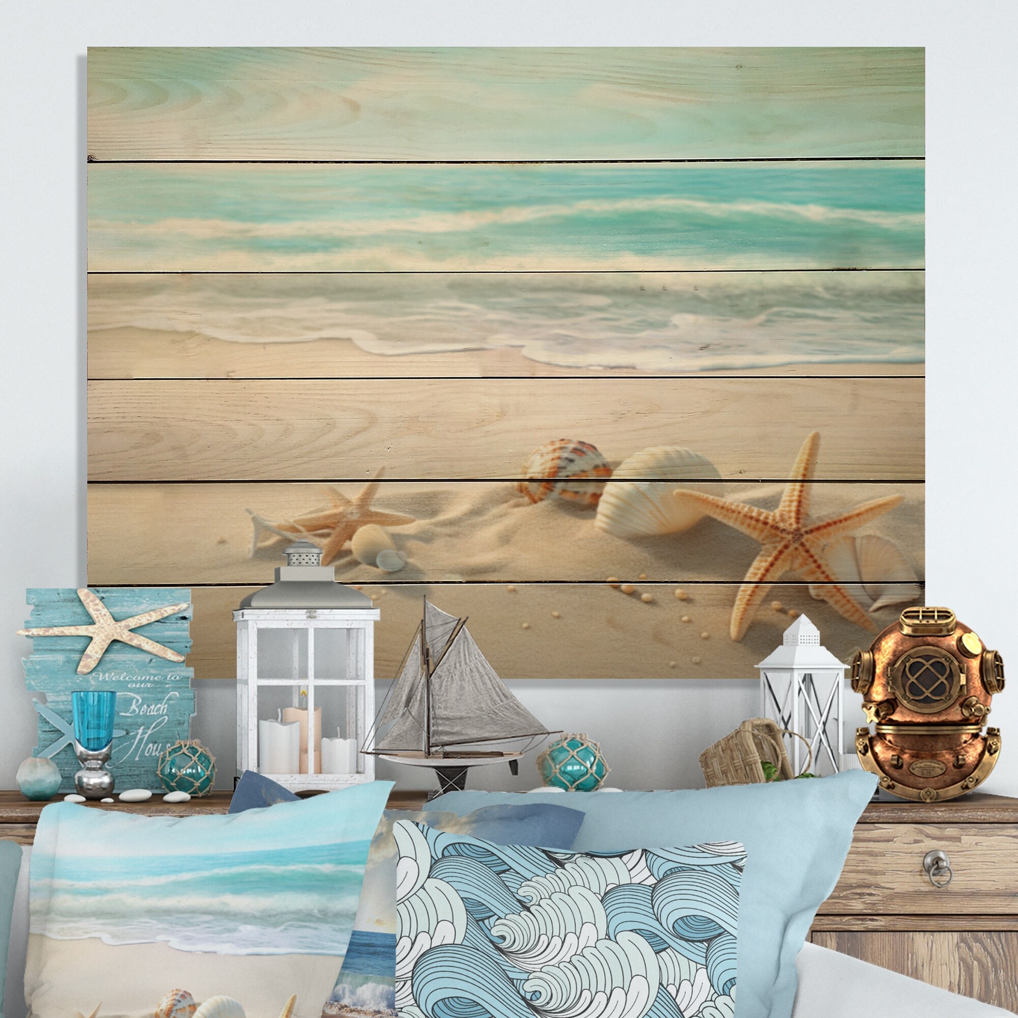 Designart "Starfish And Seashells I" Modern Landscape Beach Print on Natural Pine Wood