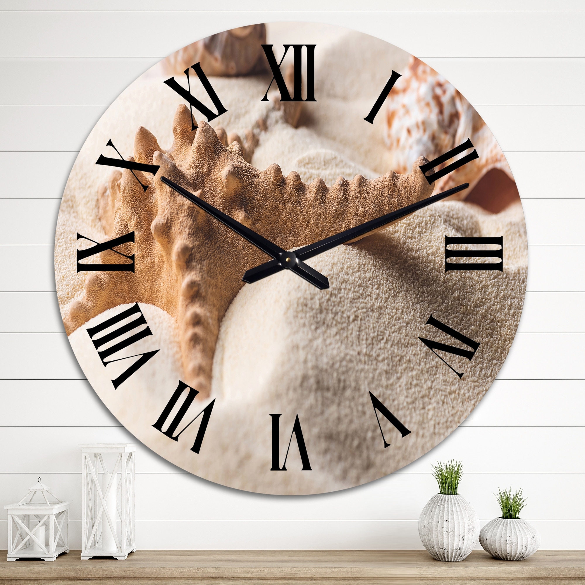 Designart 'Starfish And Seashell on Light Sand' Nautical & Coastal wall clock