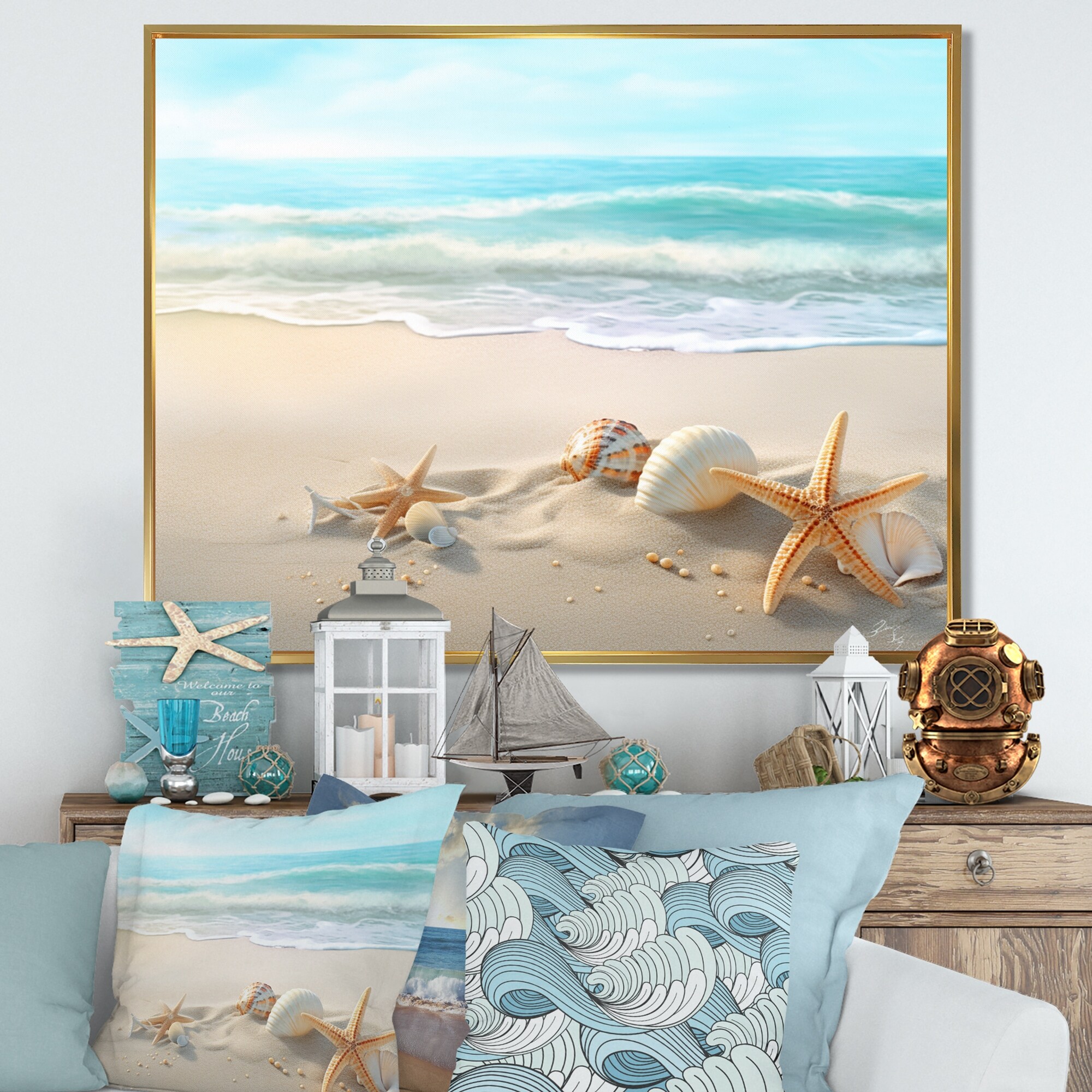 Designart "Starfish And Seashells V" Modern Landscape Beach Framed Canvas Wall Art