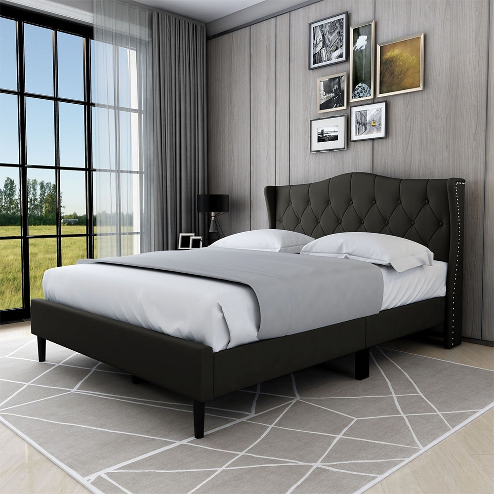 Full Size Upholstered Bed Wingback Stitched Headboard, Dark Grey