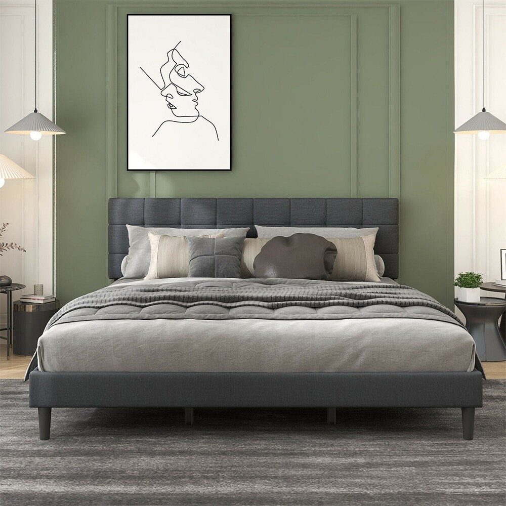 Queen Size Upholstered Bed Square Stitched Headboard, Dark Grey