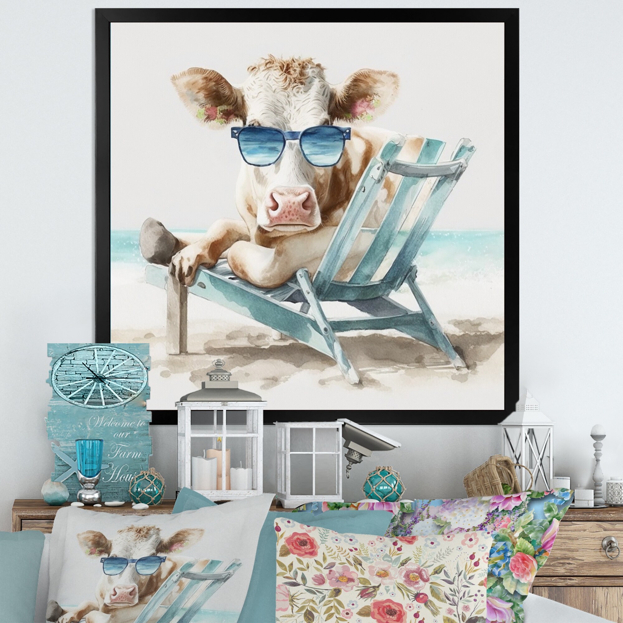 Designart "Cow Lounging With Sunglasses II" Farmhouse Framed Canvas Art Print
