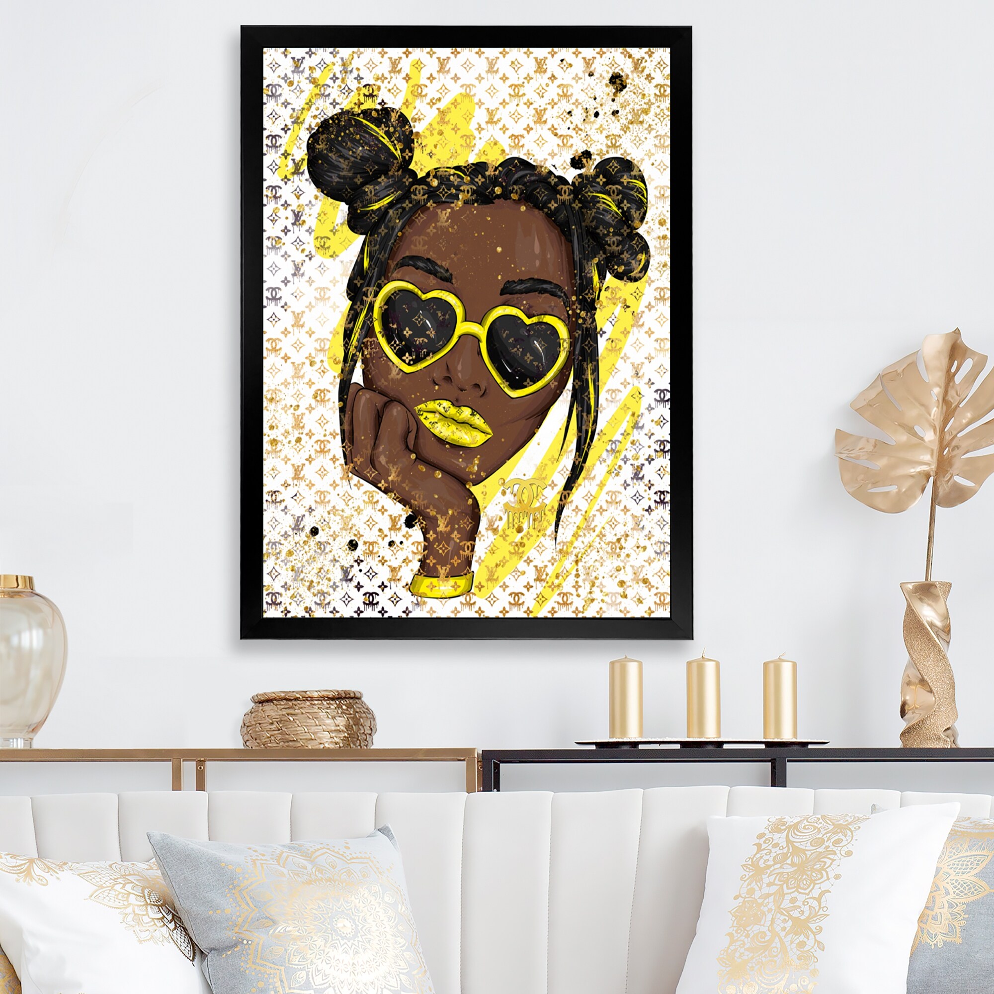 Oliver Gal Fashion and Glam Wall Art Canvas Prints 'Katy Hirschfeld - Girl and Sunglasses' Portraits - Brown, Yellow