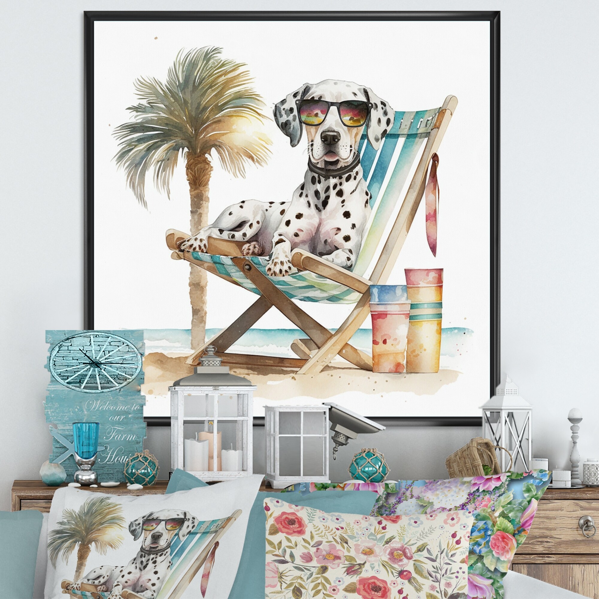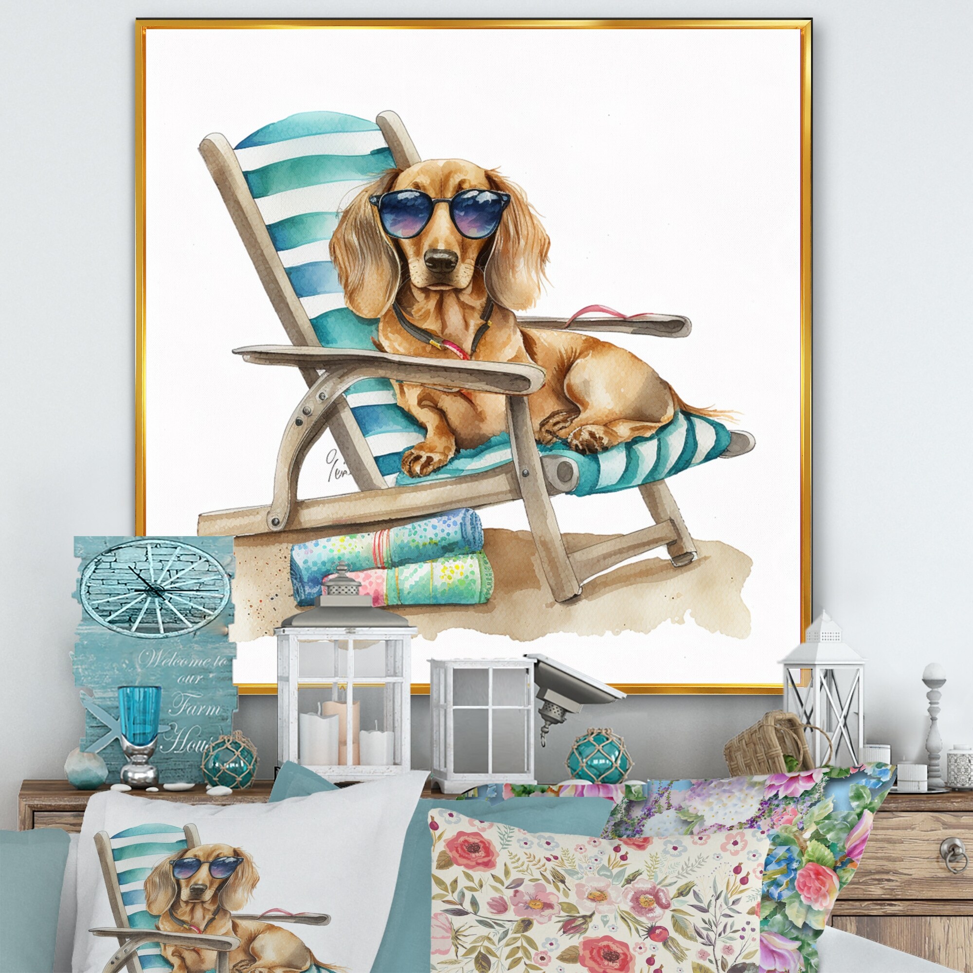 Designart "Dog Lounging on the Beach With Sunglasses V" Animals Framed Canvas Art Print