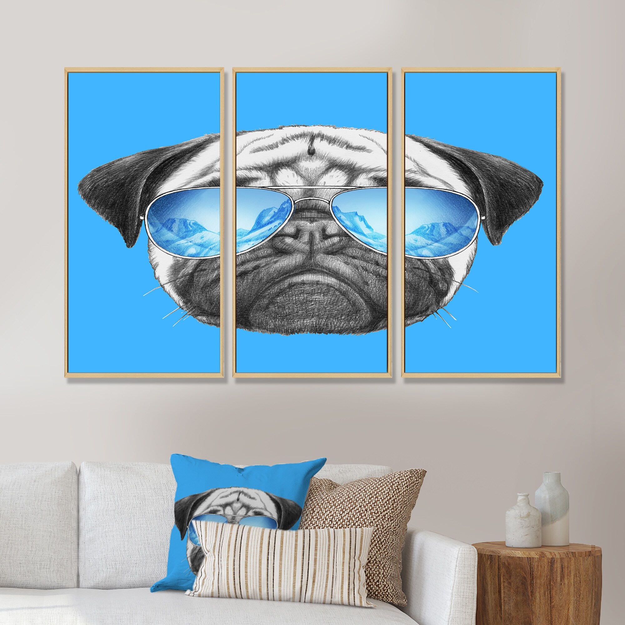 Designart "Pug Dog with Mirror Sunglasses" Animal Framed Canvas Wall Art Print Set of 3 - 4 Colors of Frames