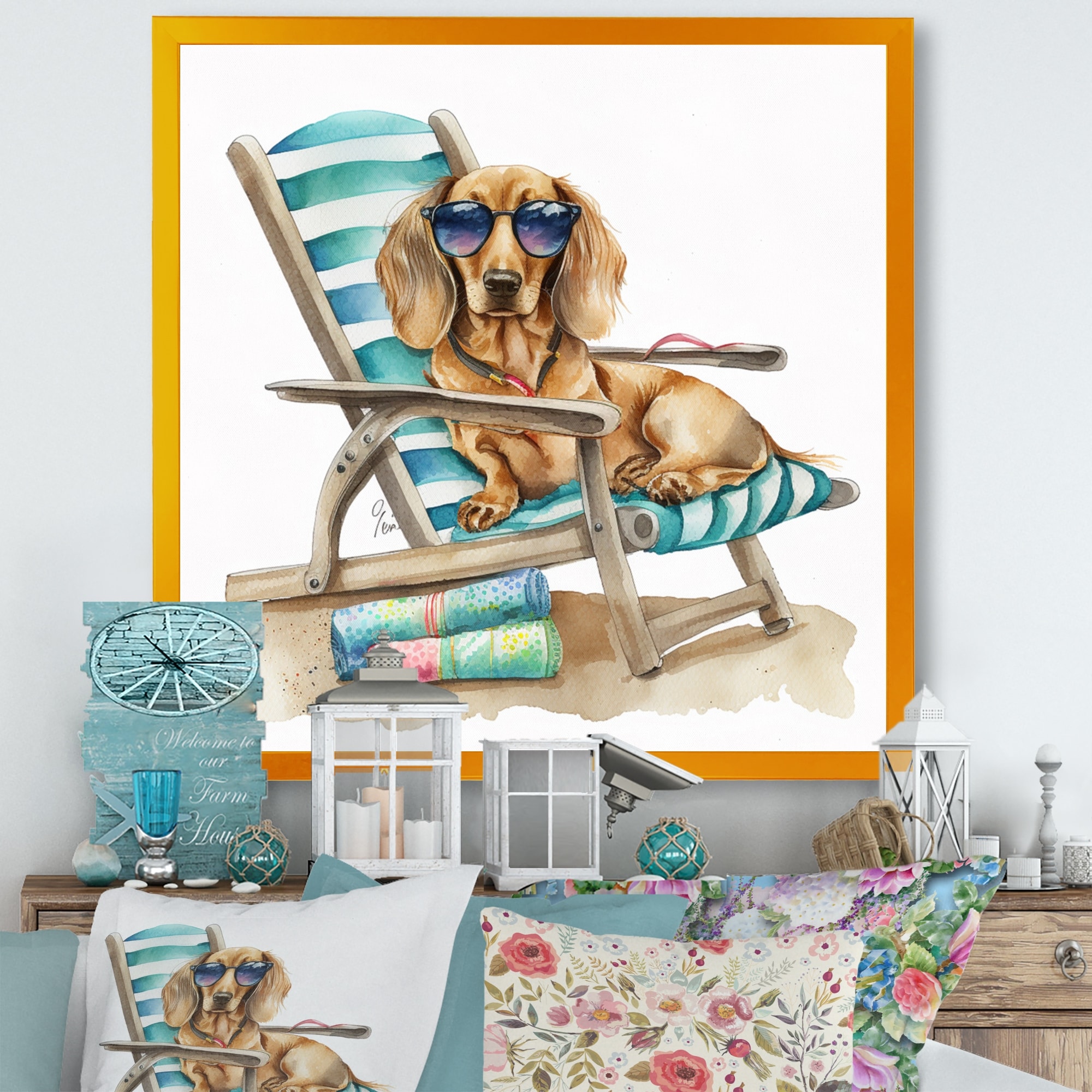 Designart "Dog Lounging on the Beach With Sunglasses V" Animals Framed Art Print