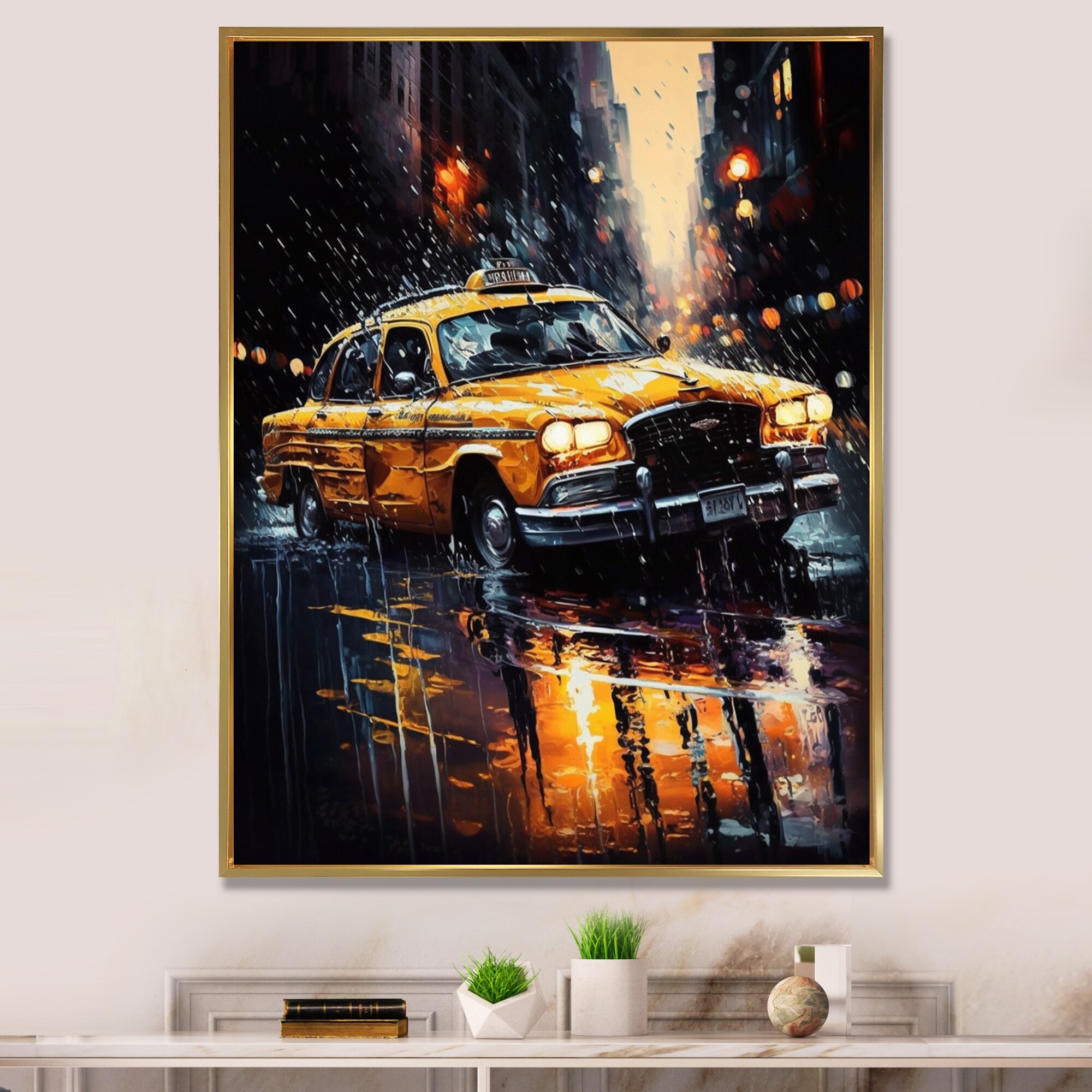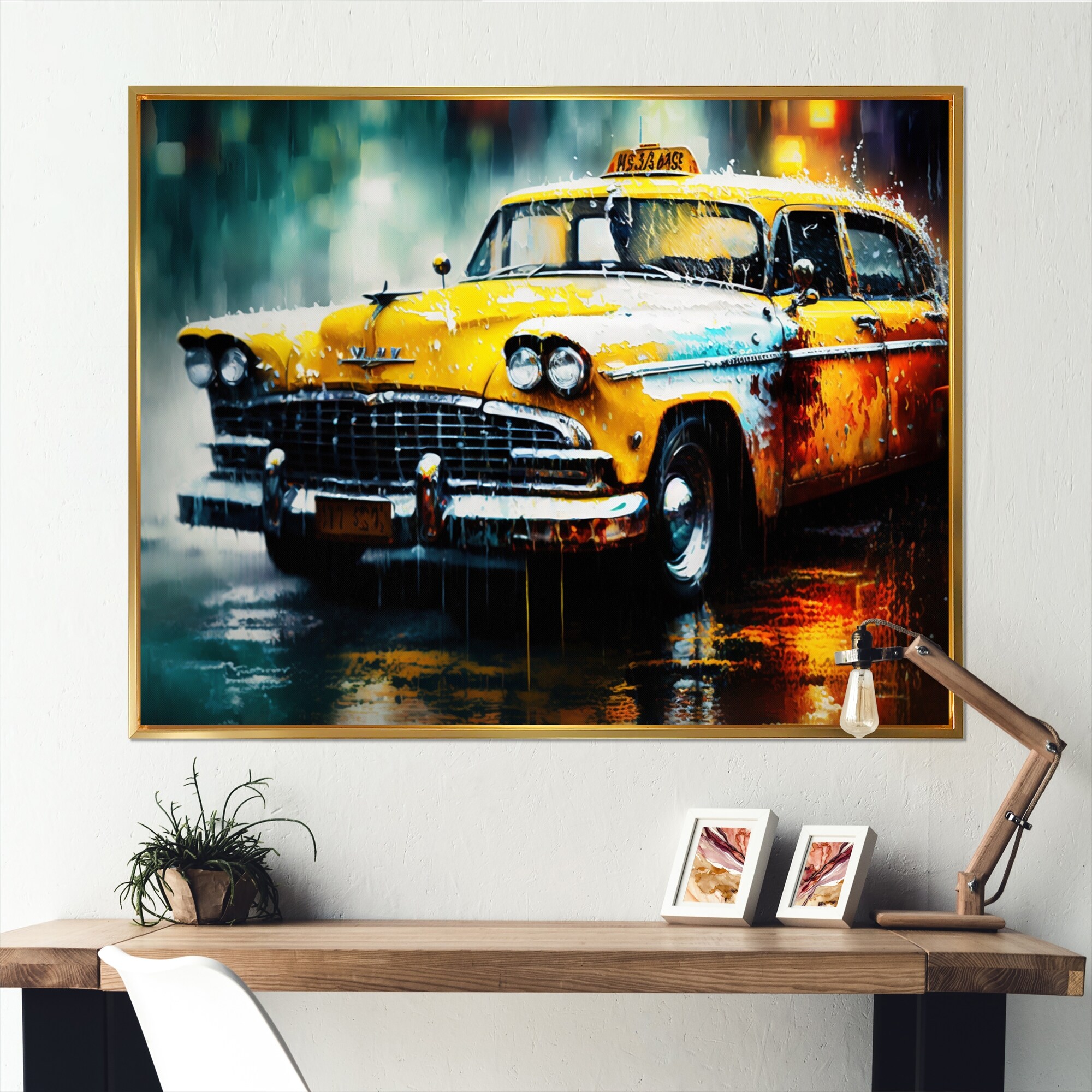 Designart "Taxi In the Rain` Ii" Retro Car Framed Canvas Art Print