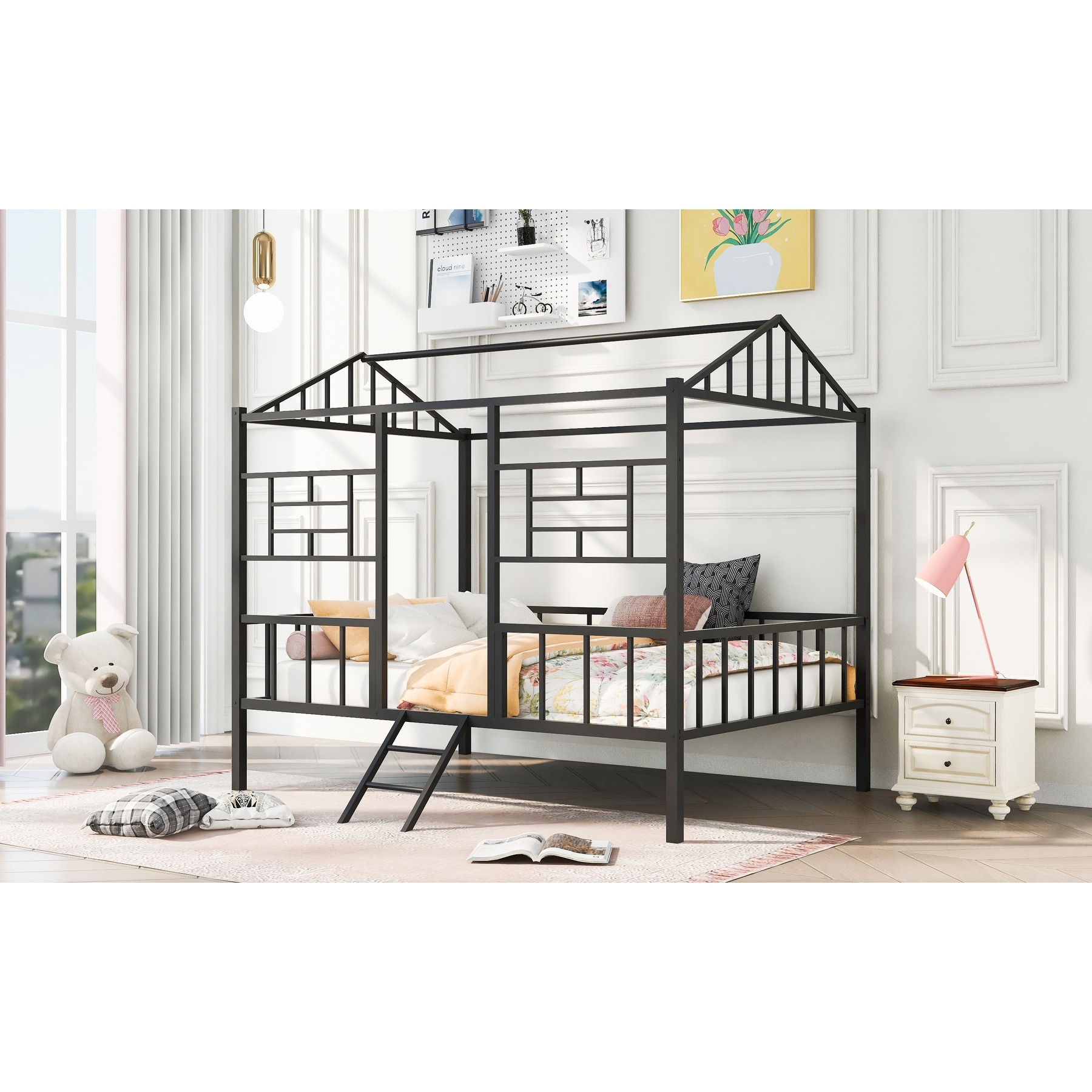 Twin over Twin Bunk Bed Metal Frame Creativity House Bed with Built-In Ladder, Full-Length Guardrail Top Bunk for Kids Teens