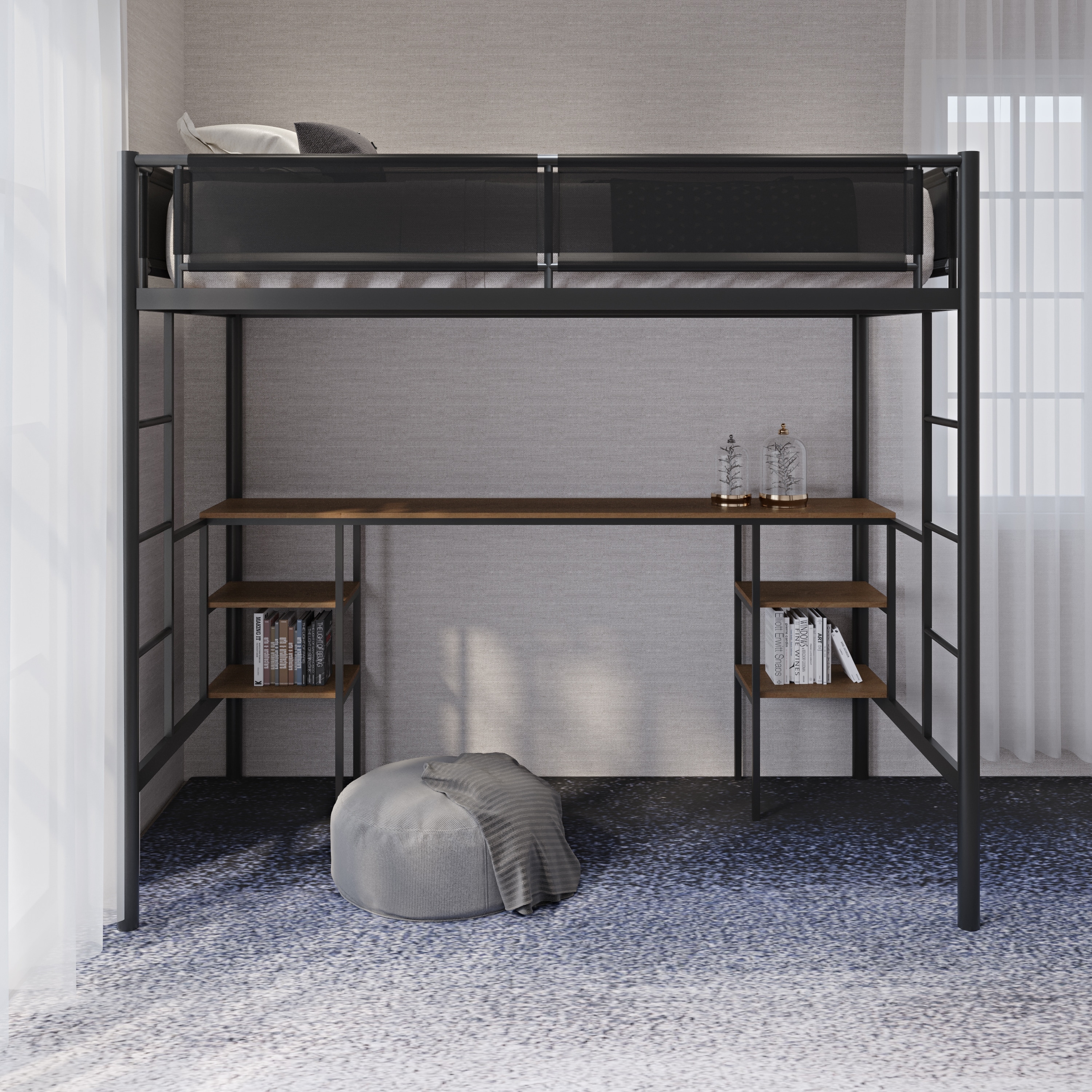 Twin Size Metal Frame Loft Bed with Full-length Guardrails Built-in desk Beneath the Bed, Each Side Storage Shelves
