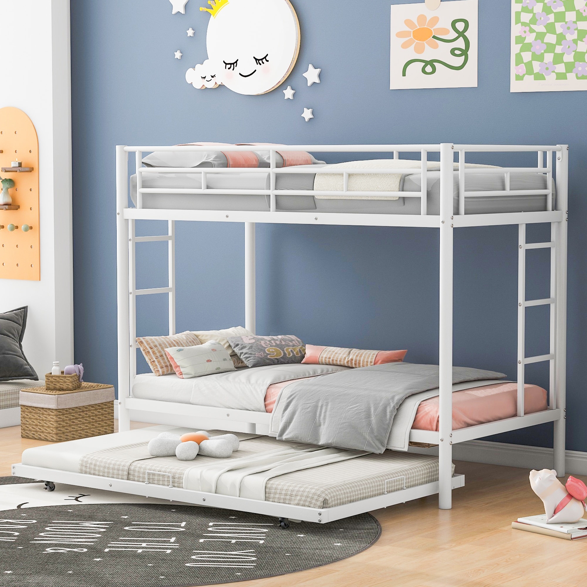 Twin Over Full Metal Bunk Bed with Twin Trundle, Sturdy Steel Bunk Bed Frame with Two-Side Ladders, No Box Spring Needed