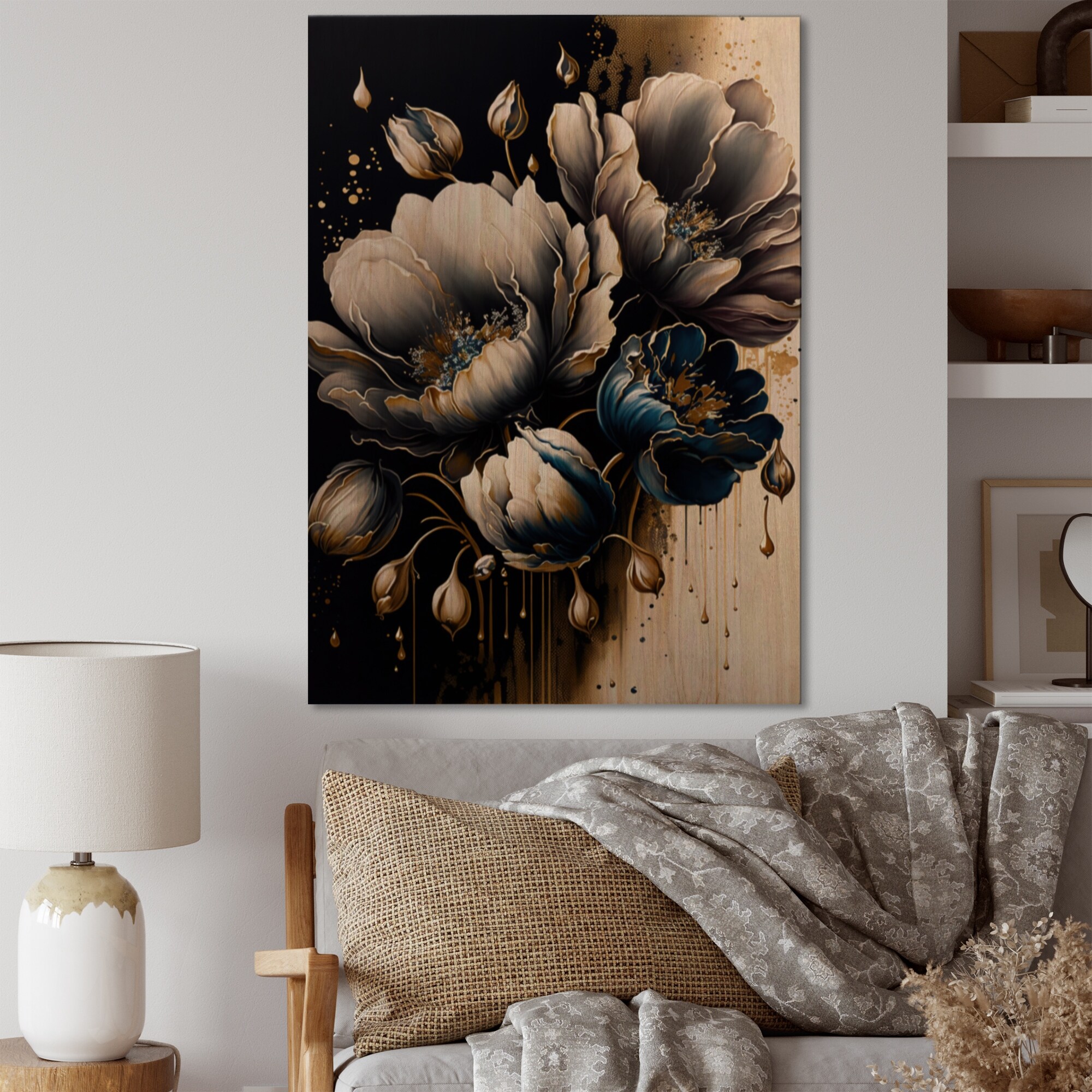 Designart 'Black And White Watercolor Roses II' Floral Tulip Wood Wall Art - Natural Pine Wood