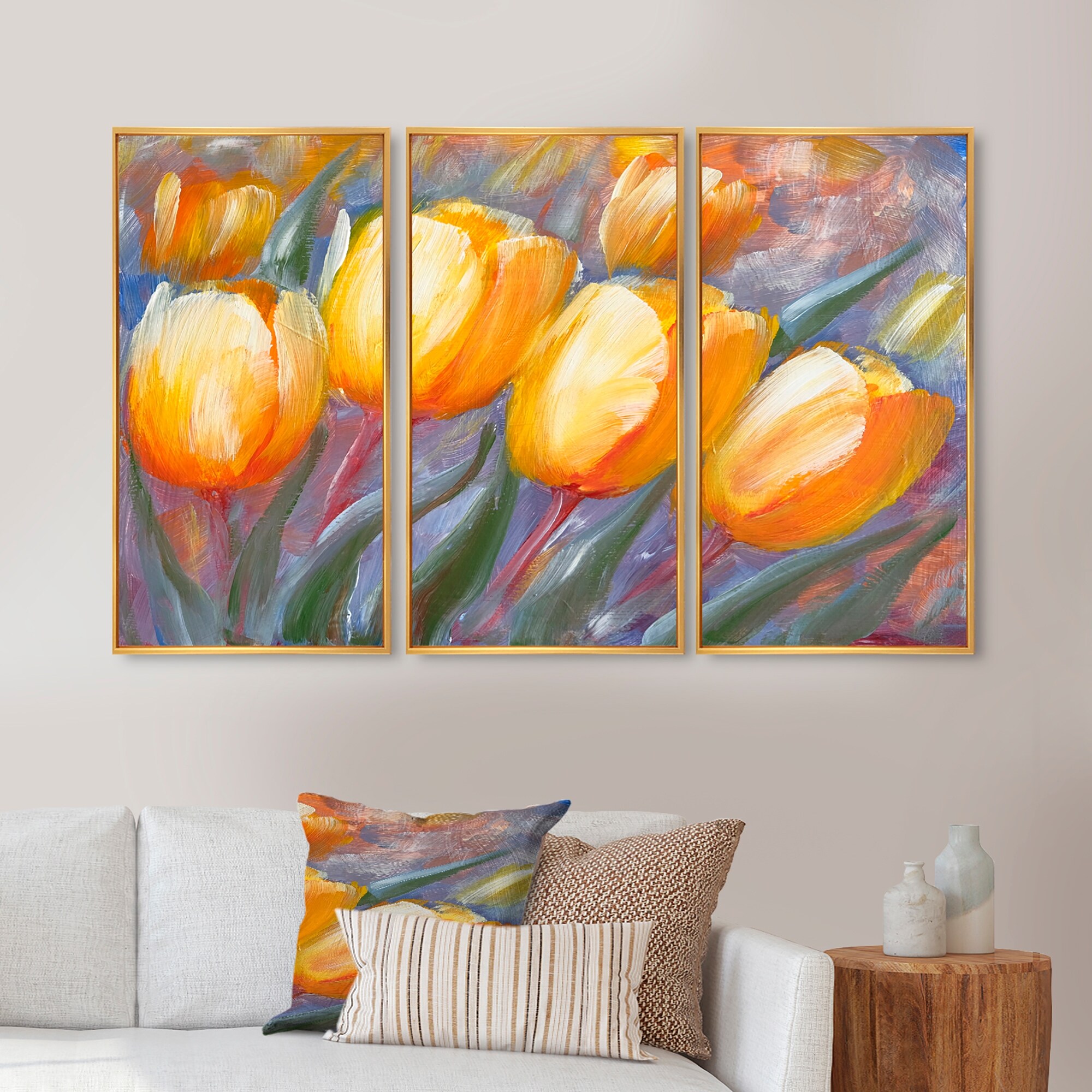 Designart "Yellow Blooming Tulips" Traditional Framed Wall Decor Set of 3 - 4 Colors of Frames