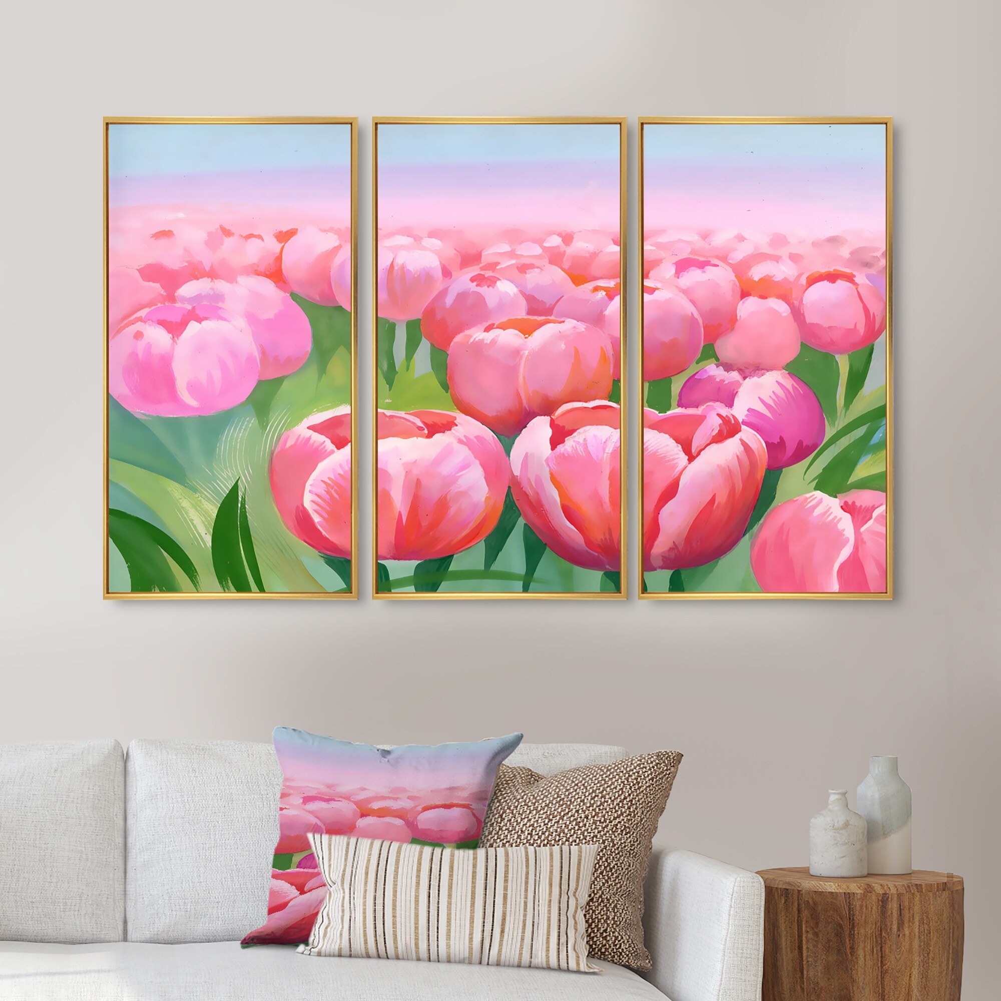 Designart "Field Of Pink Tulips in the Field" Traditional Framed Artwork Set of 3 - 4 Colors of Frames